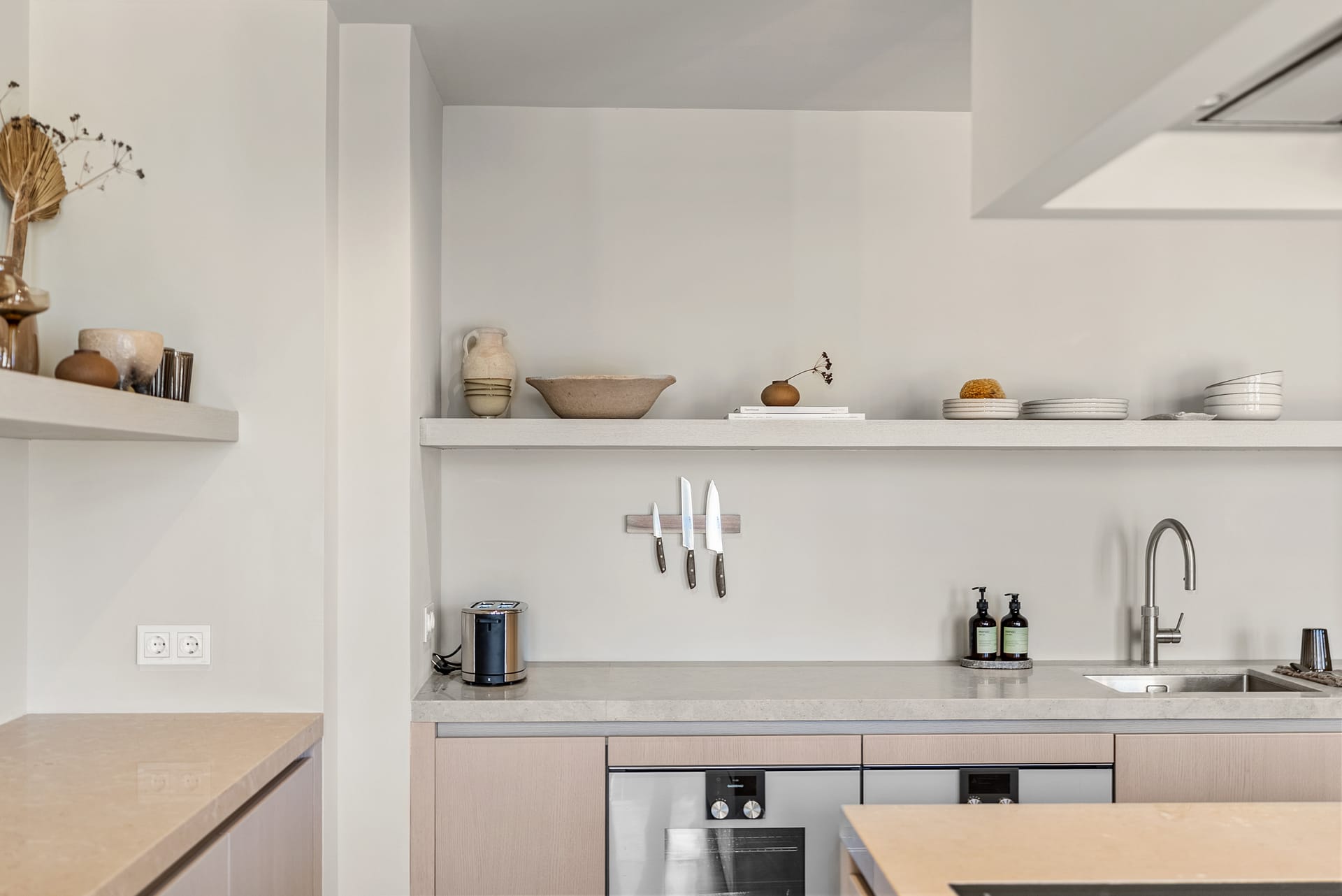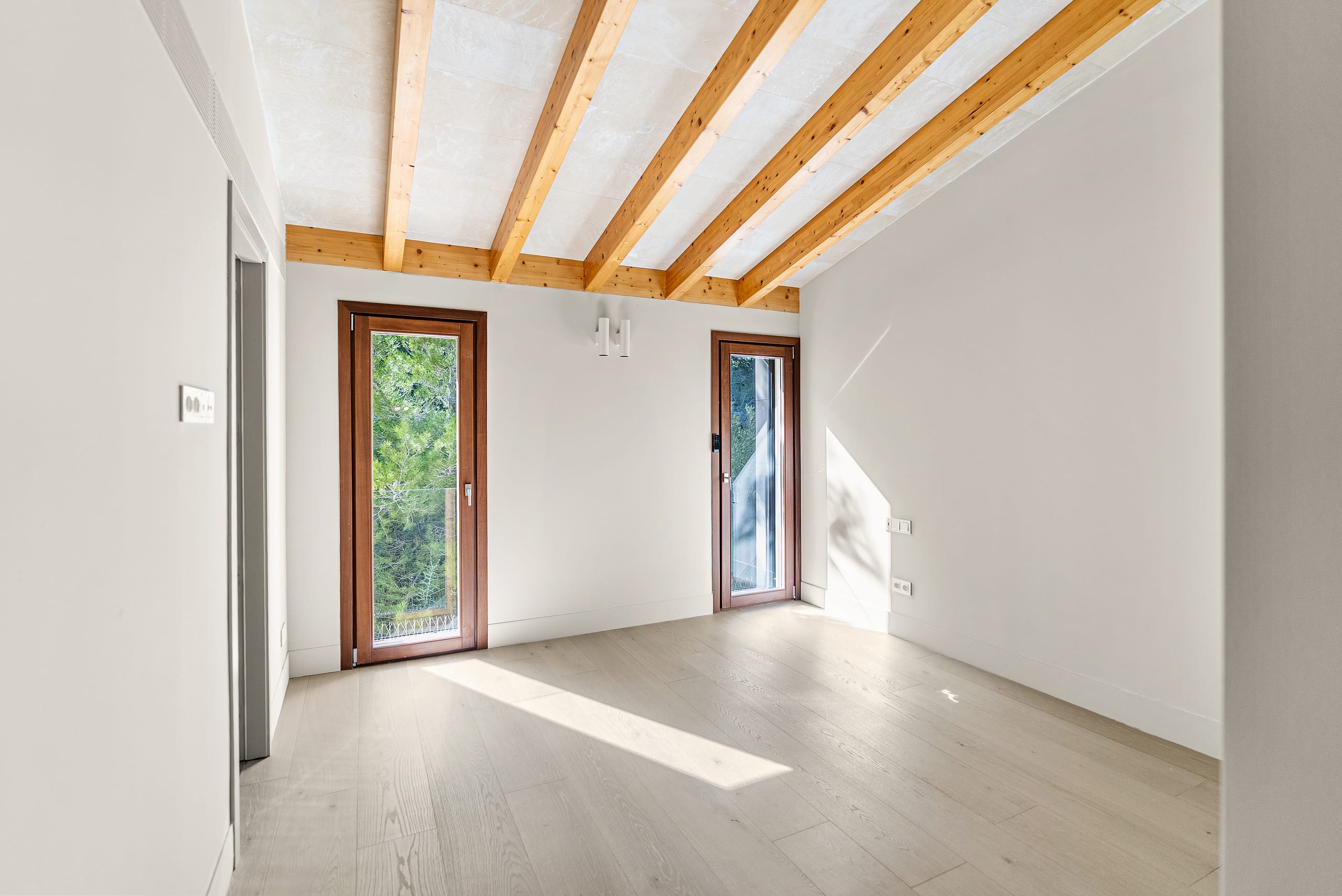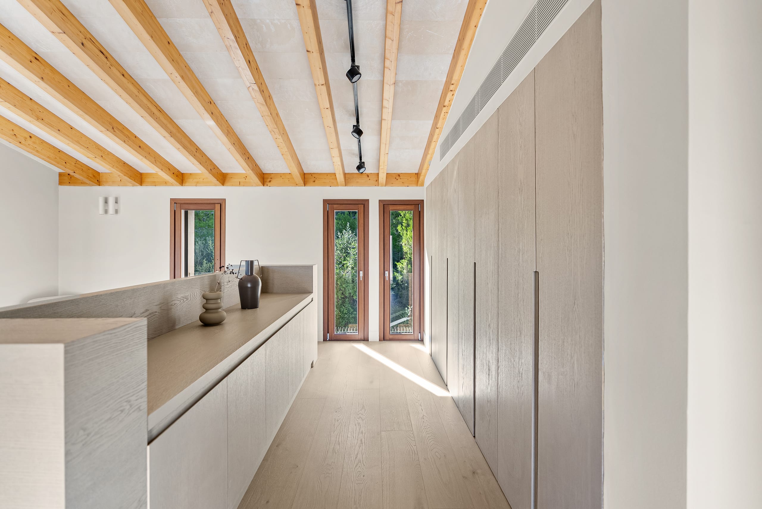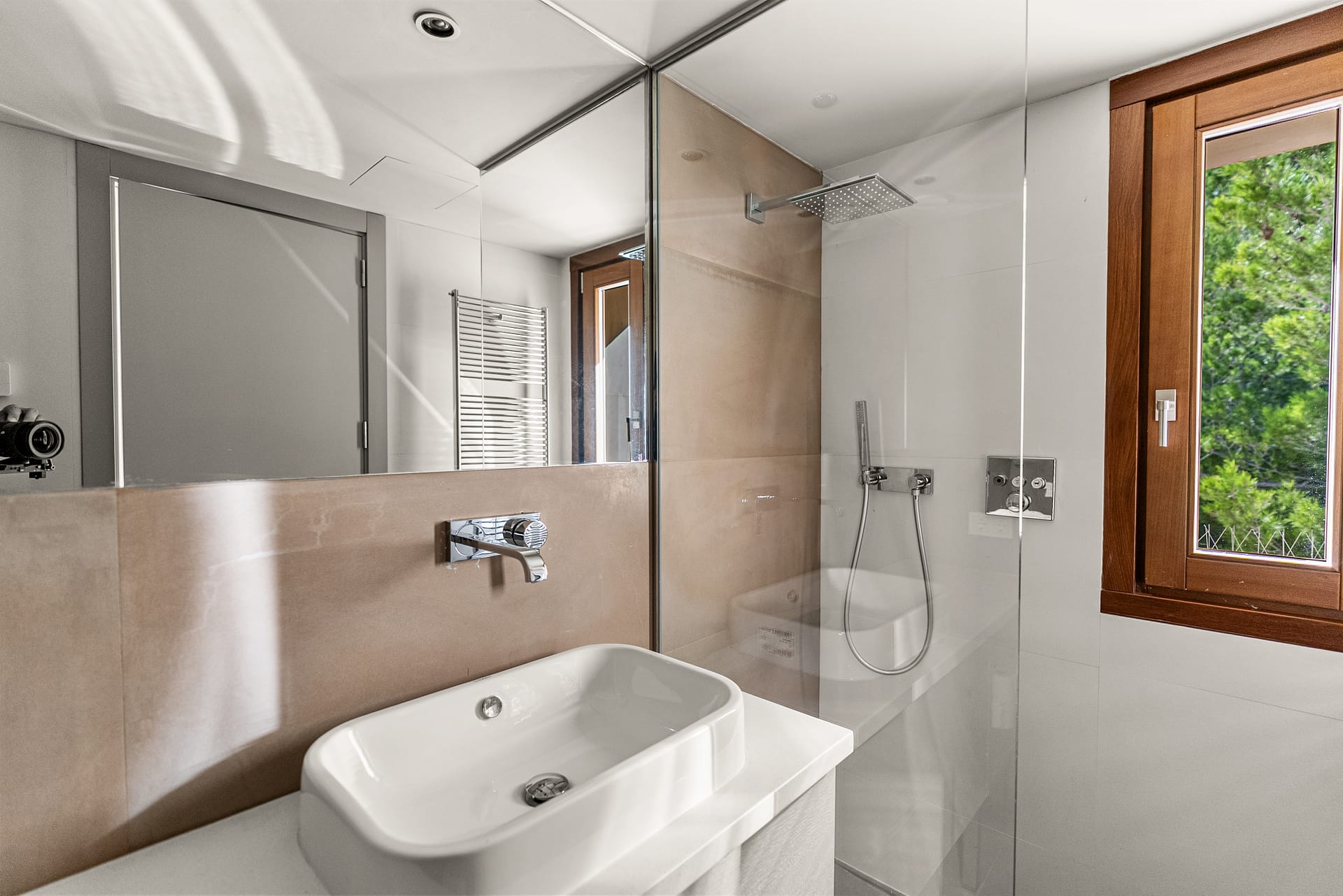 The fully equipped kitchen is a central feature of the home, fitted with top-of-the-line appliances, a large island, and ample storage. It opens naturally to the dining and living areas, creating a seamless flow for hosting and social gatherings. Outdoor living is equally impressive. A 20-metre lap pool is surrounded by expansive terraces ideal for sunbathing, outdoor dining, or simply enjoying the views towards Puig de Sant Salvador. A private driveway, beautifully framed by stone walls, leads to multiple parking areas, including a two-car garage with electric charging stations and additional guest parking.