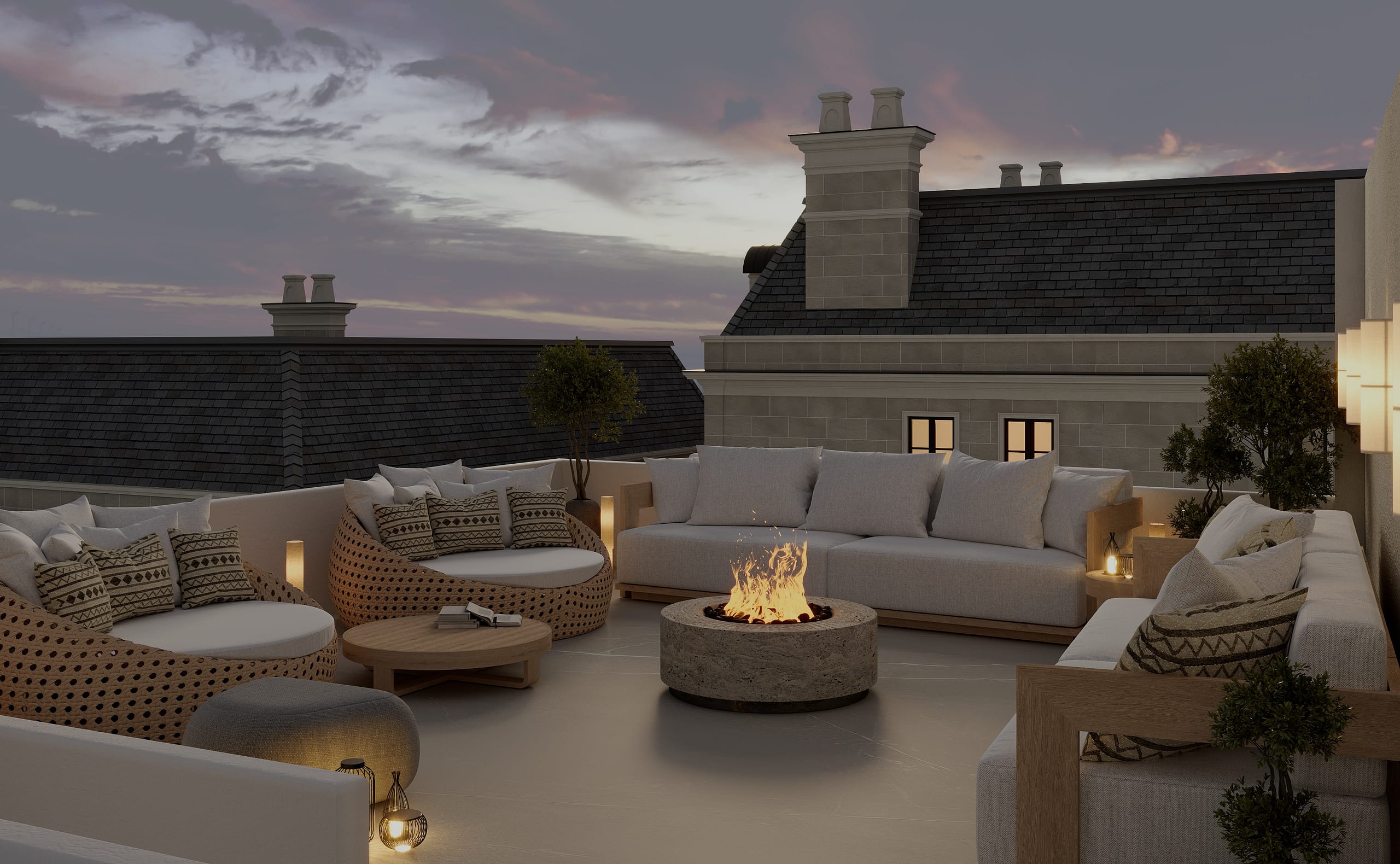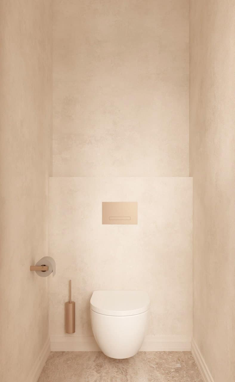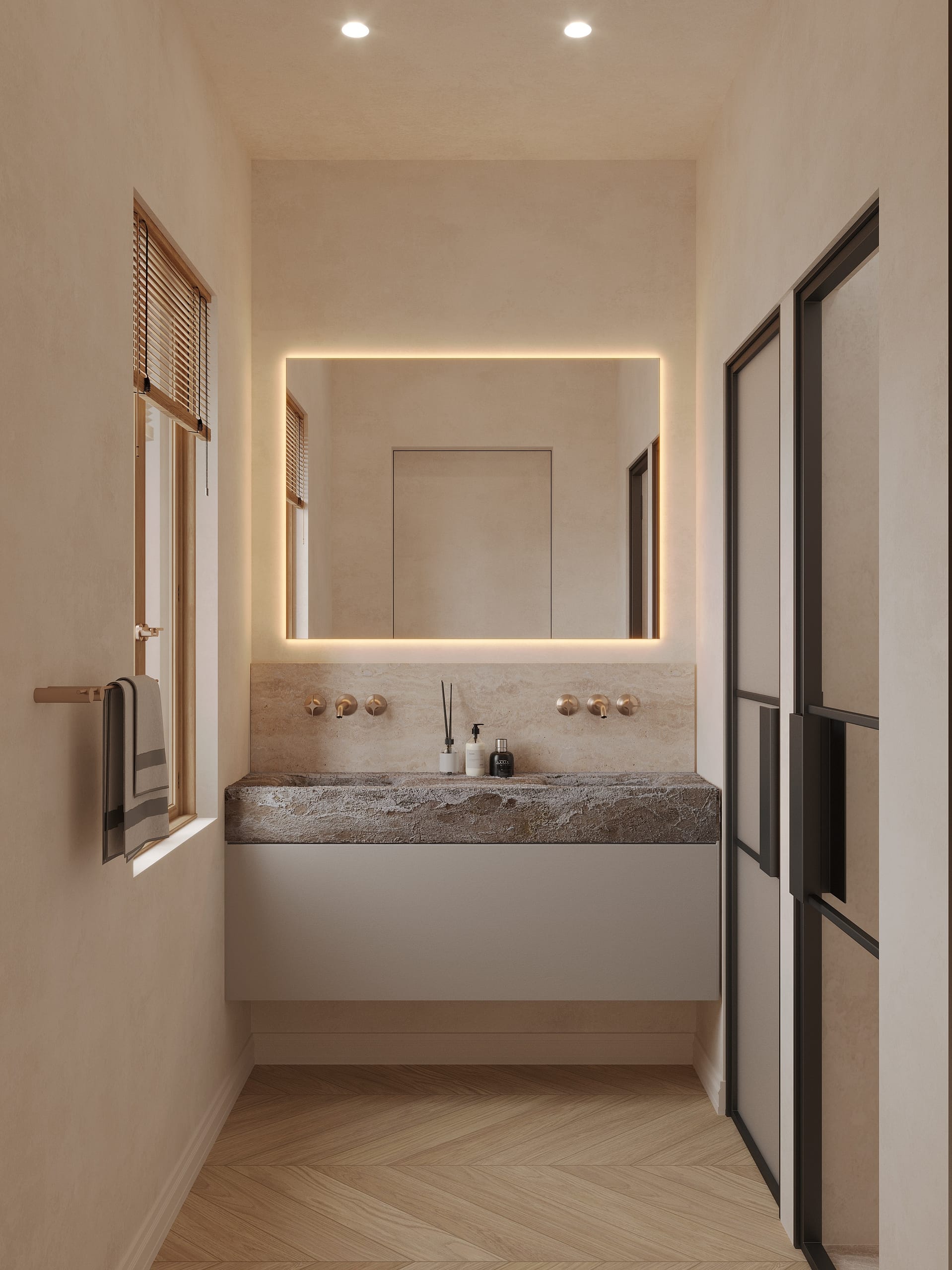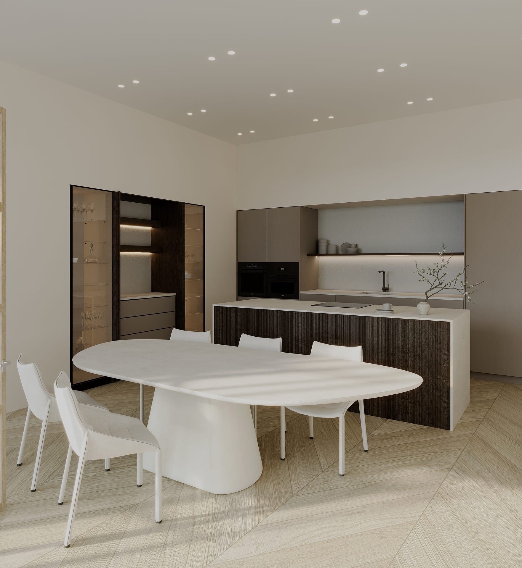 The interior design emphasizes timeless elegance, with natural oak herringbone flooring, natural stone finishes, decorative moldings, and carefully selected materials that create a sophisticated yet warm atmosphere throughout the home.