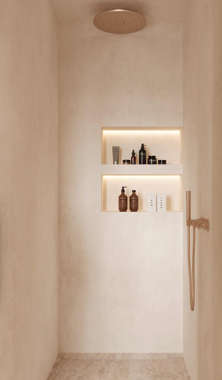 On the upper level, the residence offers two additional bedrooms, including generous storage and dressing areas, along with two further bathrooms. A secondary kitchen or service area and access to the building’s community terrace provide additional flexibility for guests or extended stays.