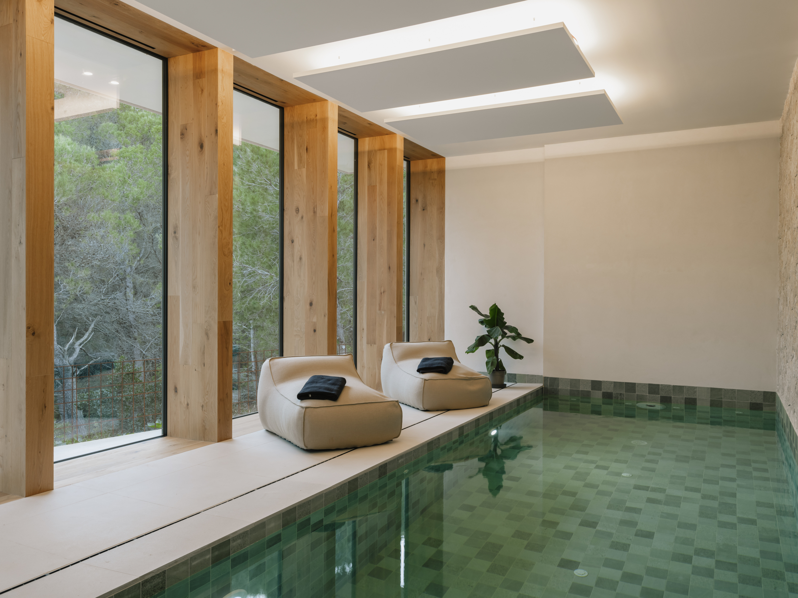 A standout feature is the stunning spa area, complete with a generous indoor pool, a sauna, and a Turkish bath. Floor-to-ceiling glass windows offer a seamless connection to nature, creating a truly unique and tranquil retreat. Additionally, a spacious room next to the spa is ideal for a gym. The rooftop, featuring a jacuzzi, provides the perfect space to unwind while enjoying panoramic sea and cathedral vistas.