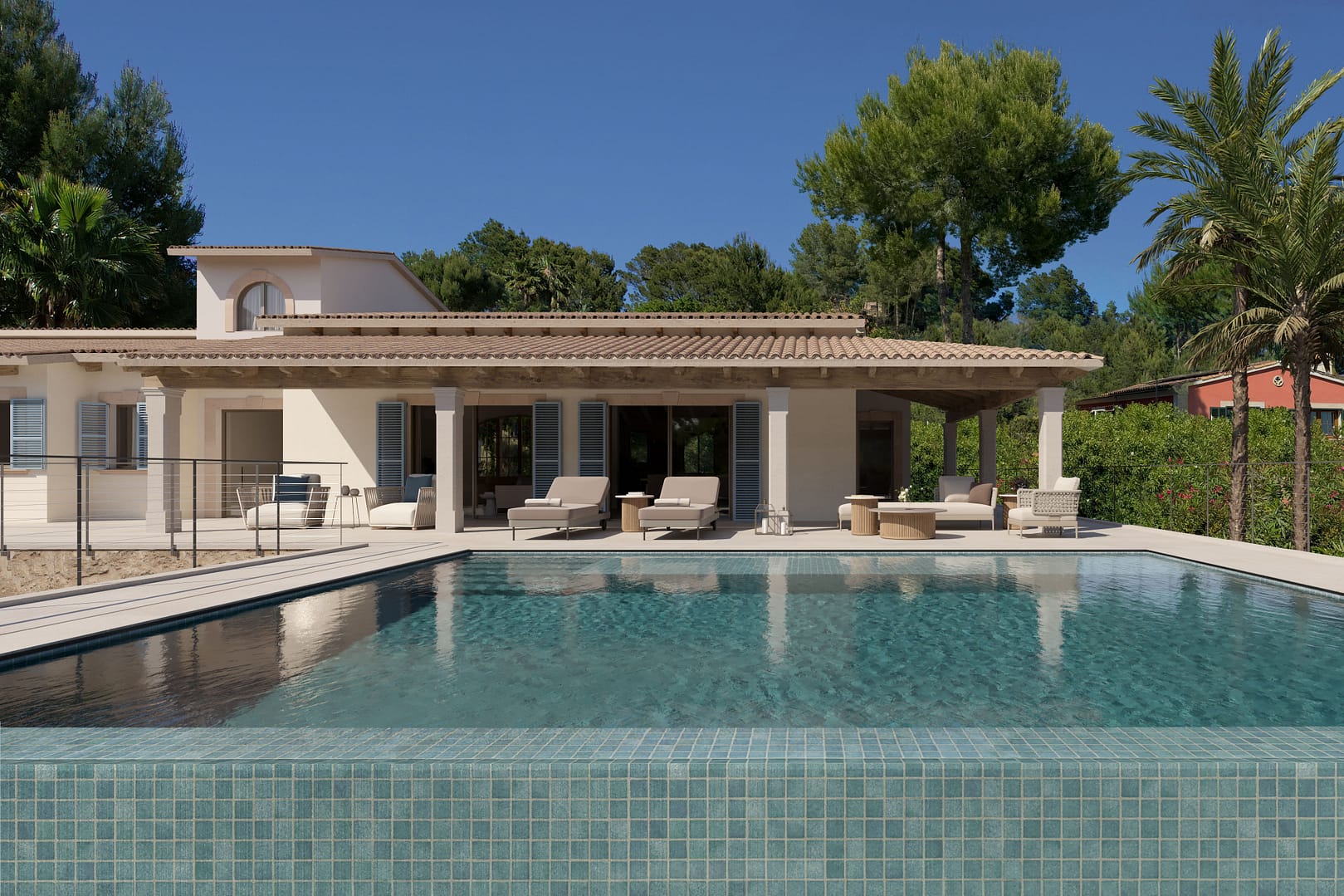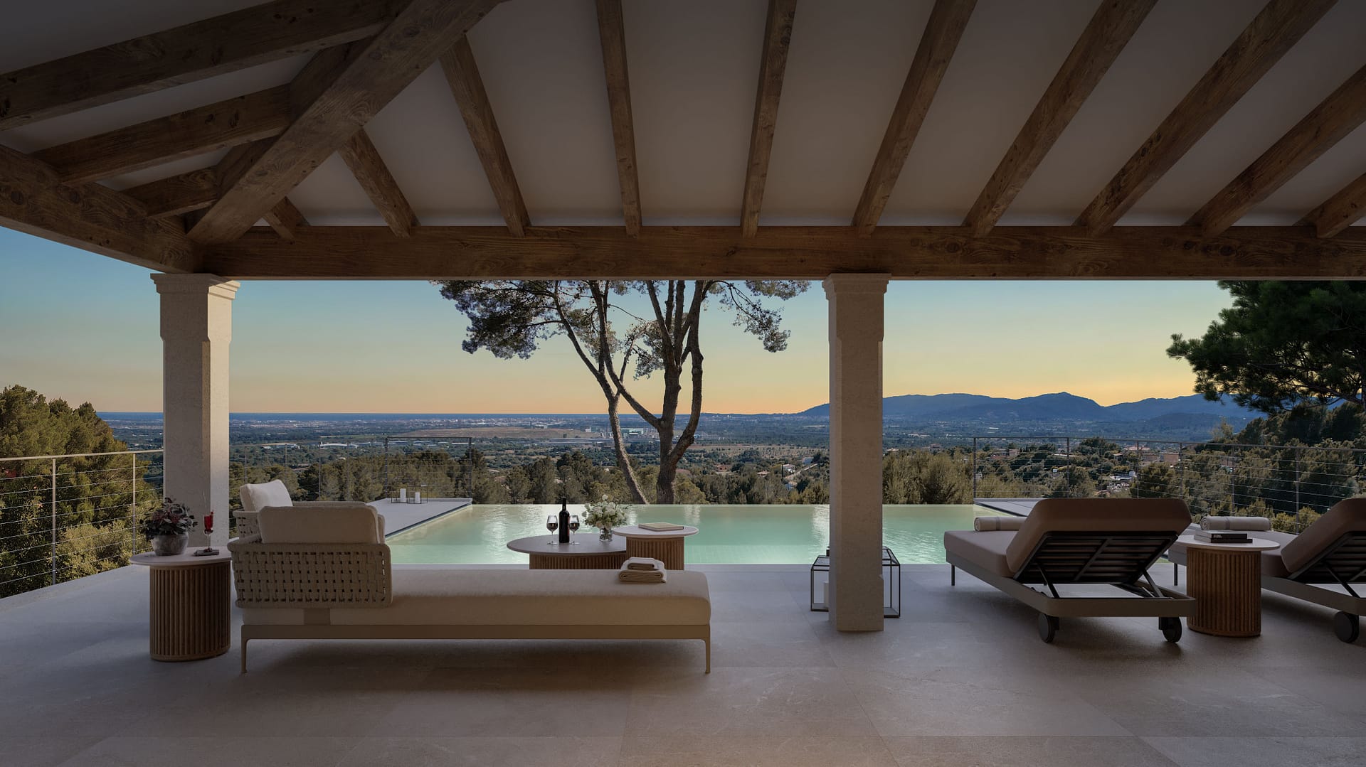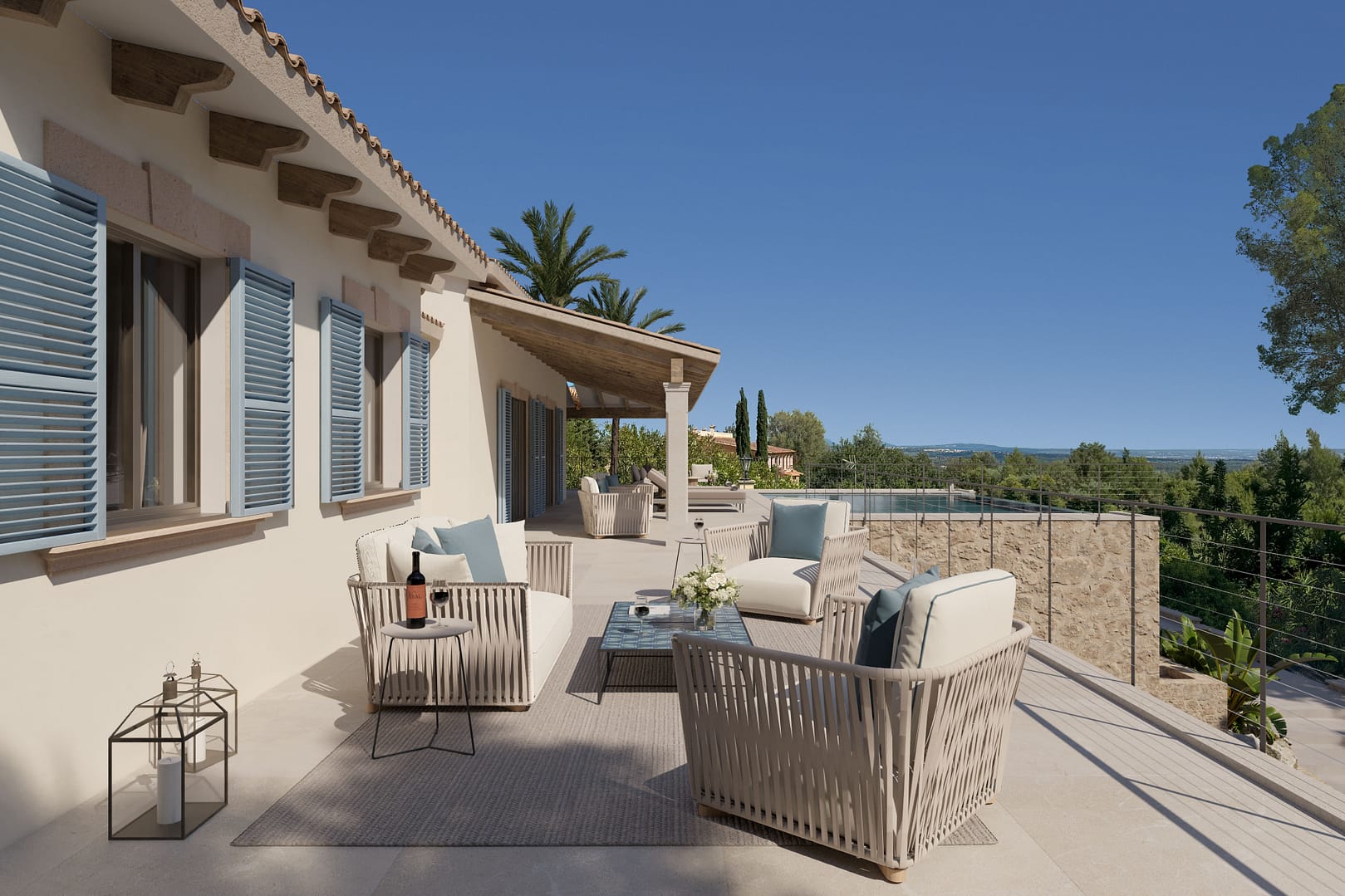 This beautiful villa offers an exceptional living experience within the exclusive Sa Coma Villas Park, perched 180 meters above sea level. This south-west facing property is bathed in sunlight throughout the day, offering breathtaking panoramic views of Palma Bay and spectacular sunsets. Its prime location provides convenient access to amenities, with the Son Termens golf course just a 5-minute drive away, and Palma's city center and airport reachable within 15 minutes. The charming town of Sóller, with its picturesque fishing port and beaches, is a mere 10-minute drive.