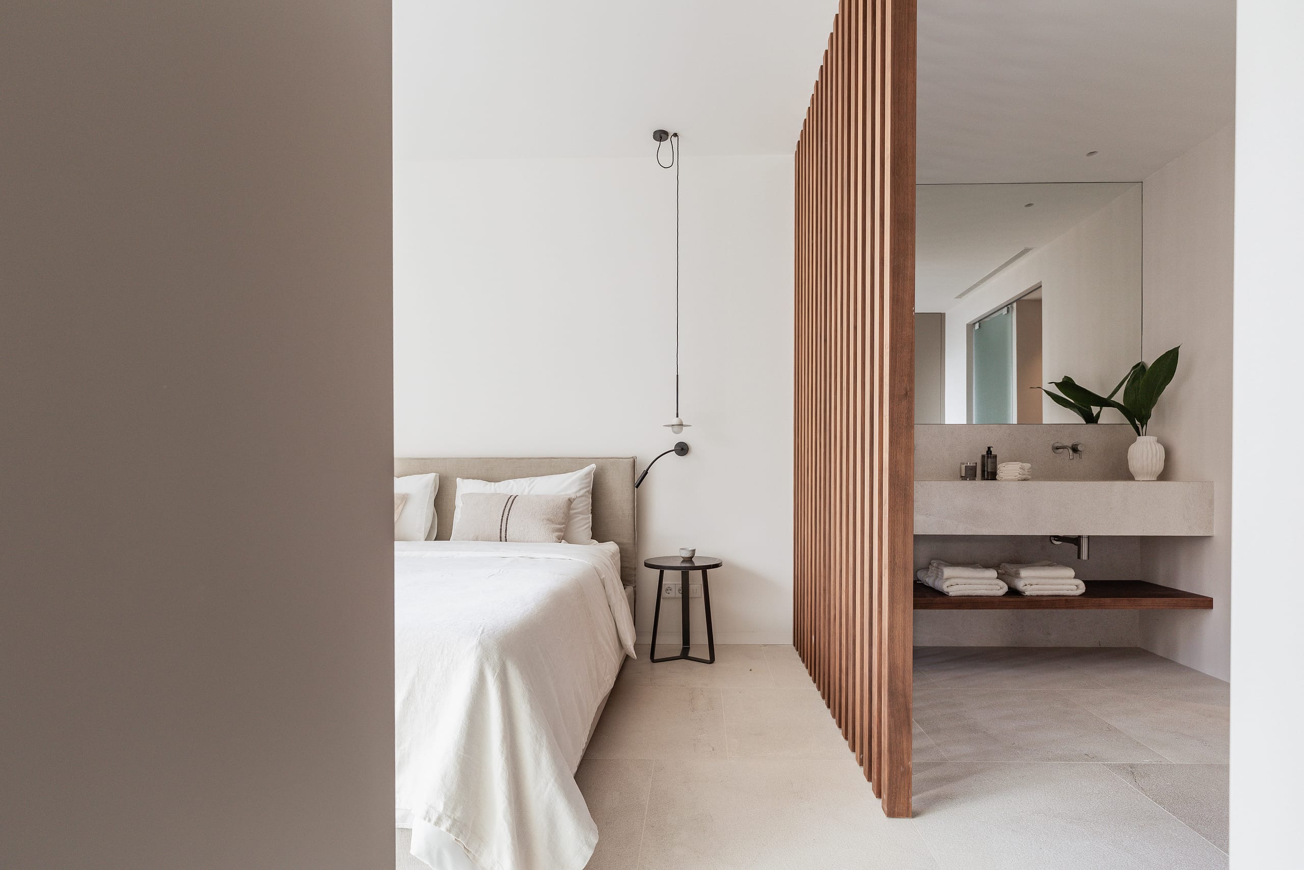 The residence features two well-proportioned bedrooms and two bathrooms, including a tranquil master suite with an en-suite bathroom. Natural materials, soft textures, and refined finishes reflect the architectural vision of Rafael Vidal and interior designer María Vidal, resulting in a calm and timeless interior that feels both sophisticated and welcoming.