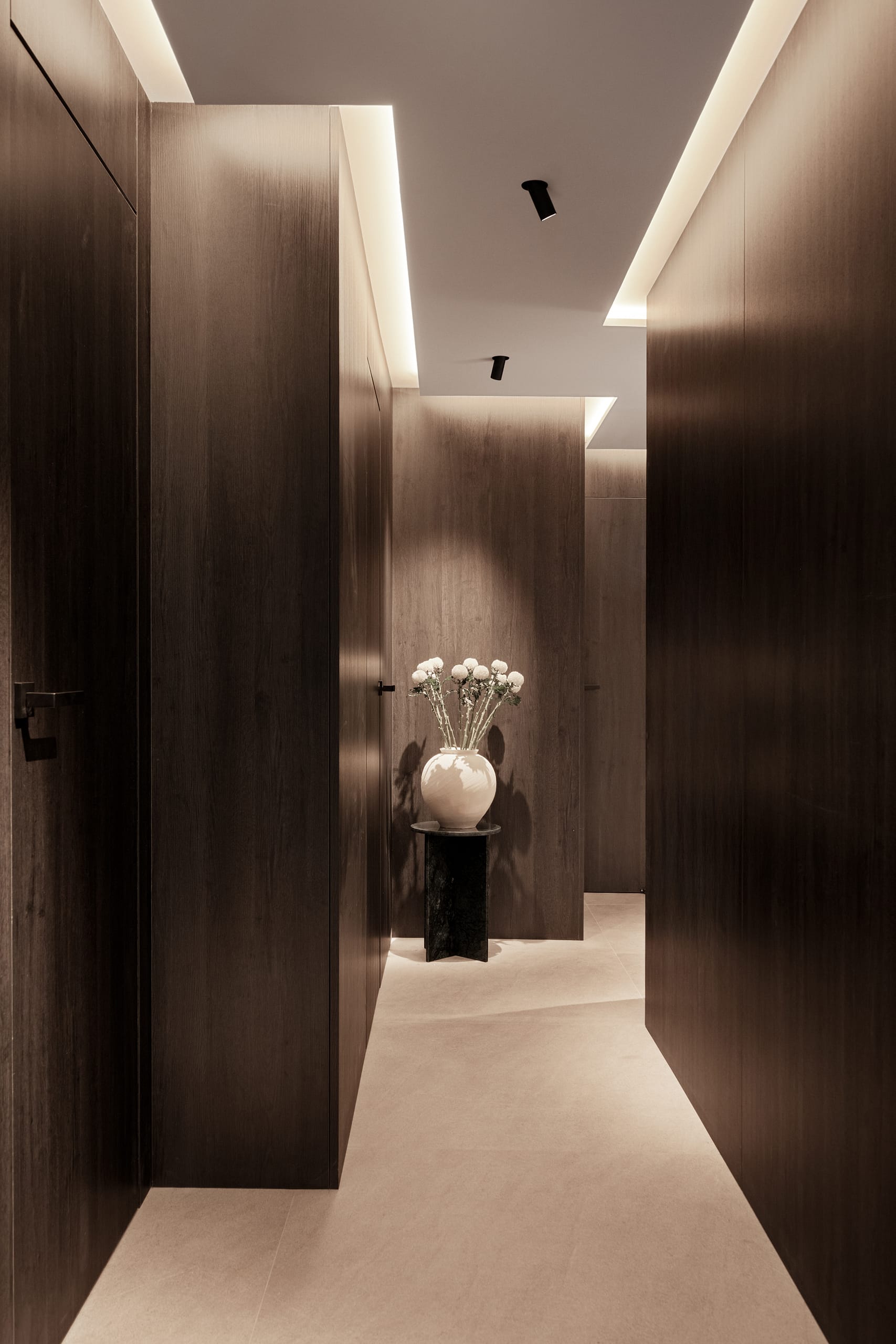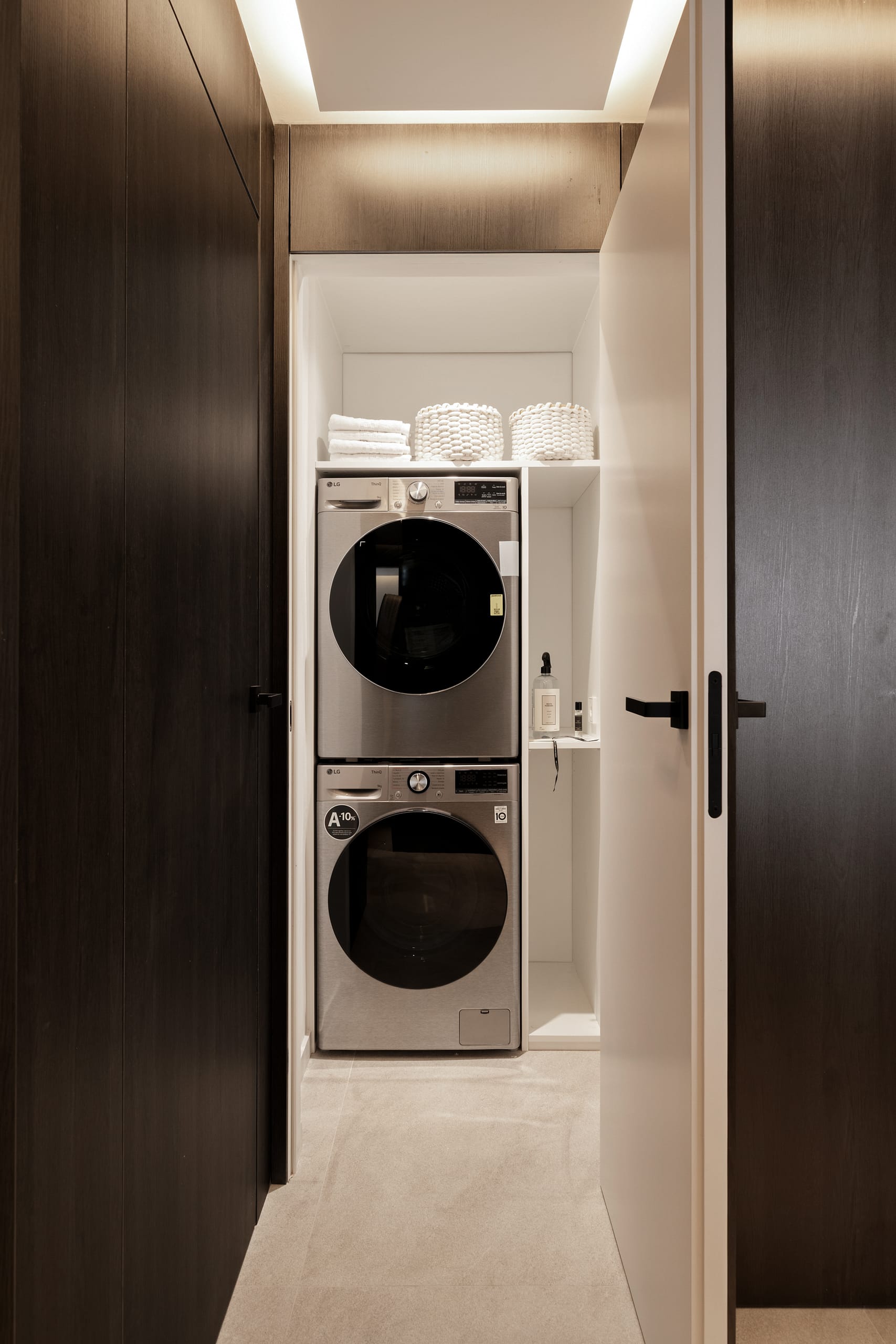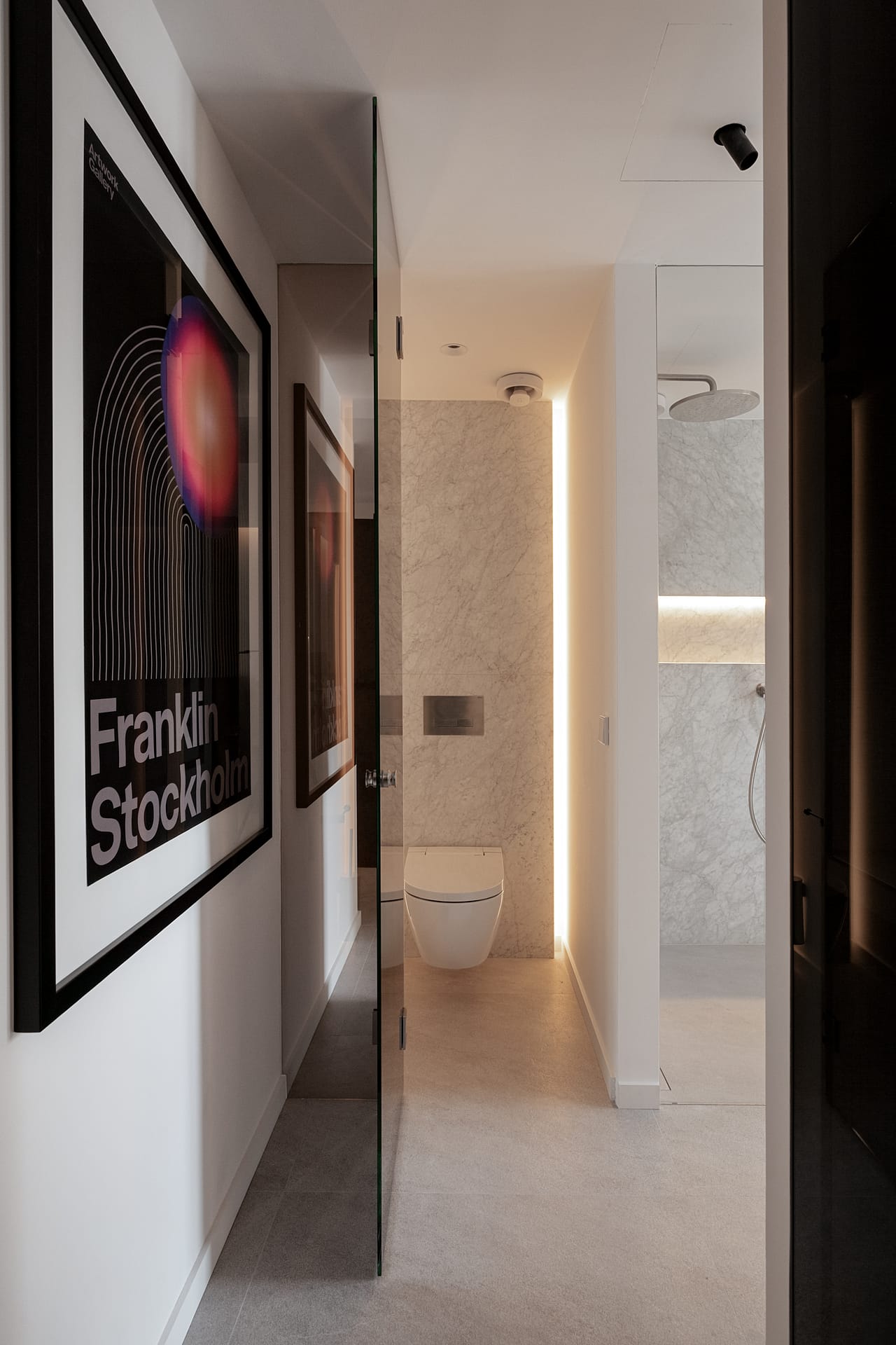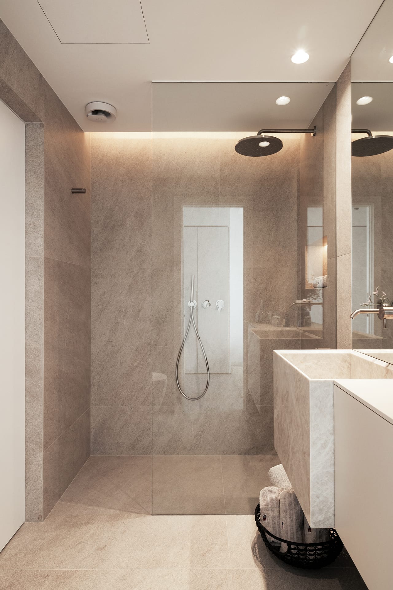 The main living level features 136 m² of sophisticated interior space, where custom-made finishes, Gaggenau appliances, bespoke wardrobes, and Carrara marble bathrooms create a calm and luxurious atmosphere. Large windows frame the sea and city skyline, ensuring that every room enjoys a remarkable backdrop. The seamless connection between the living area, dining space, and modern kitchen enhances both everyday comfort and effortless entertaining.