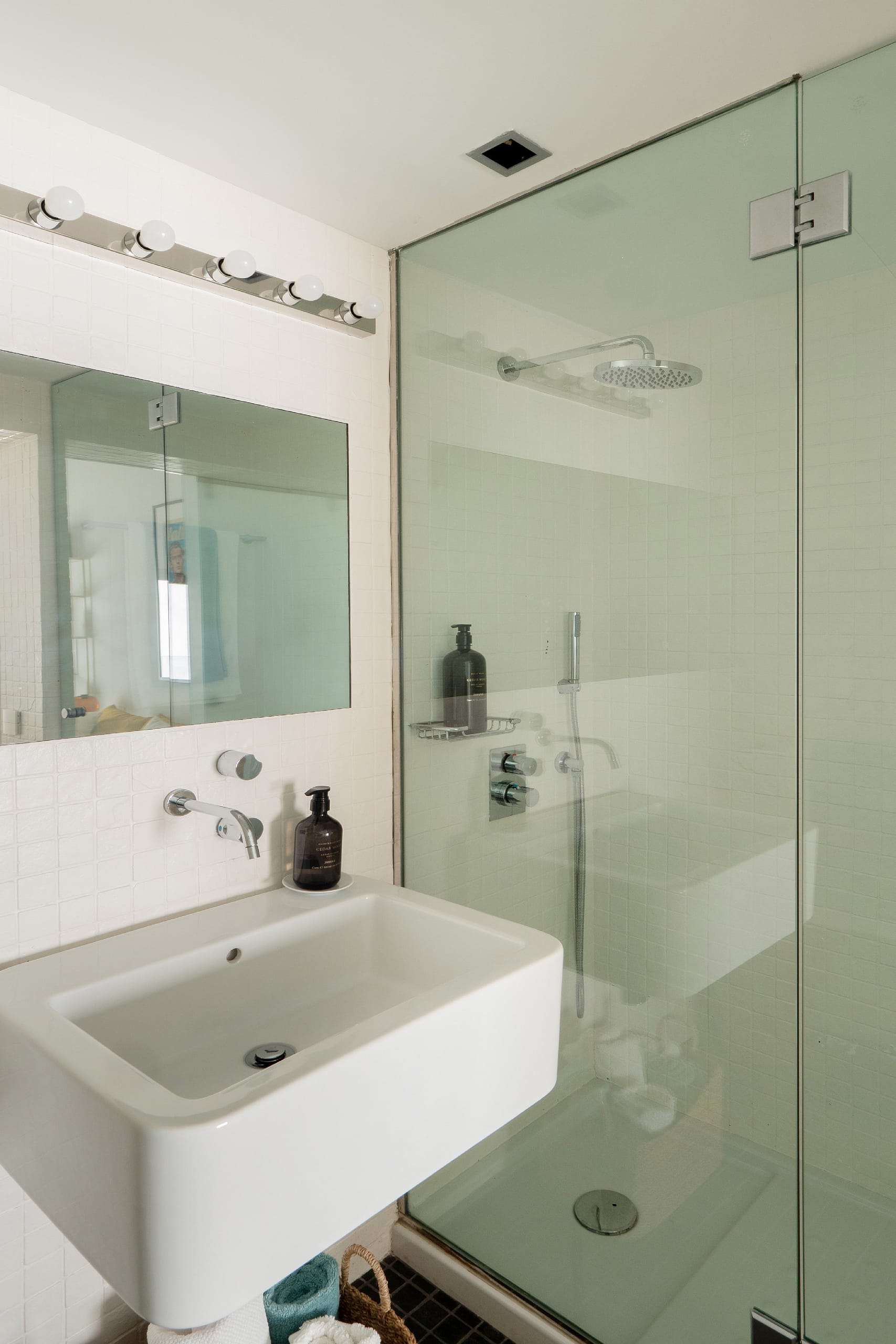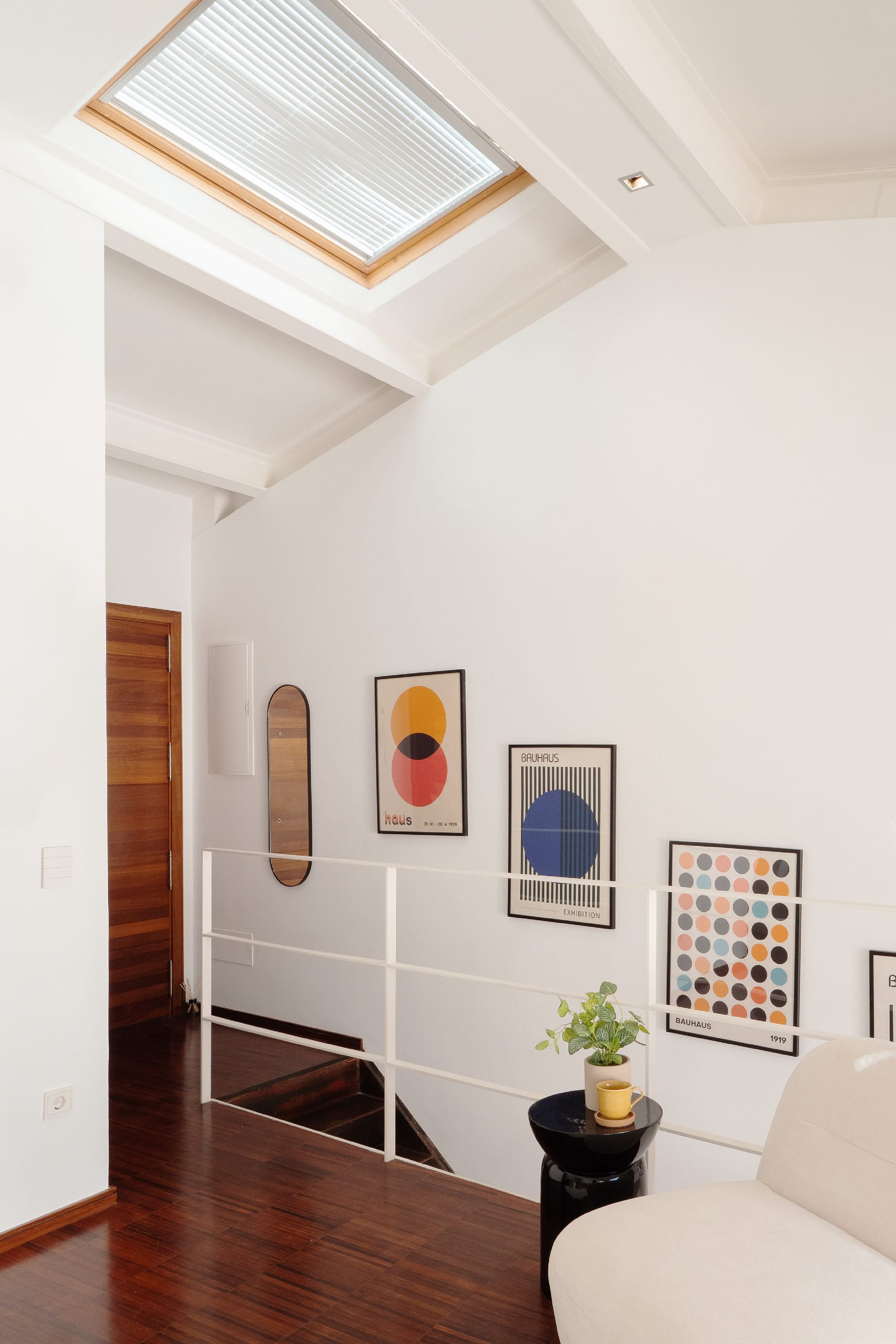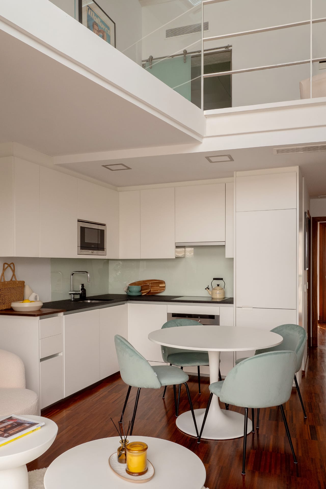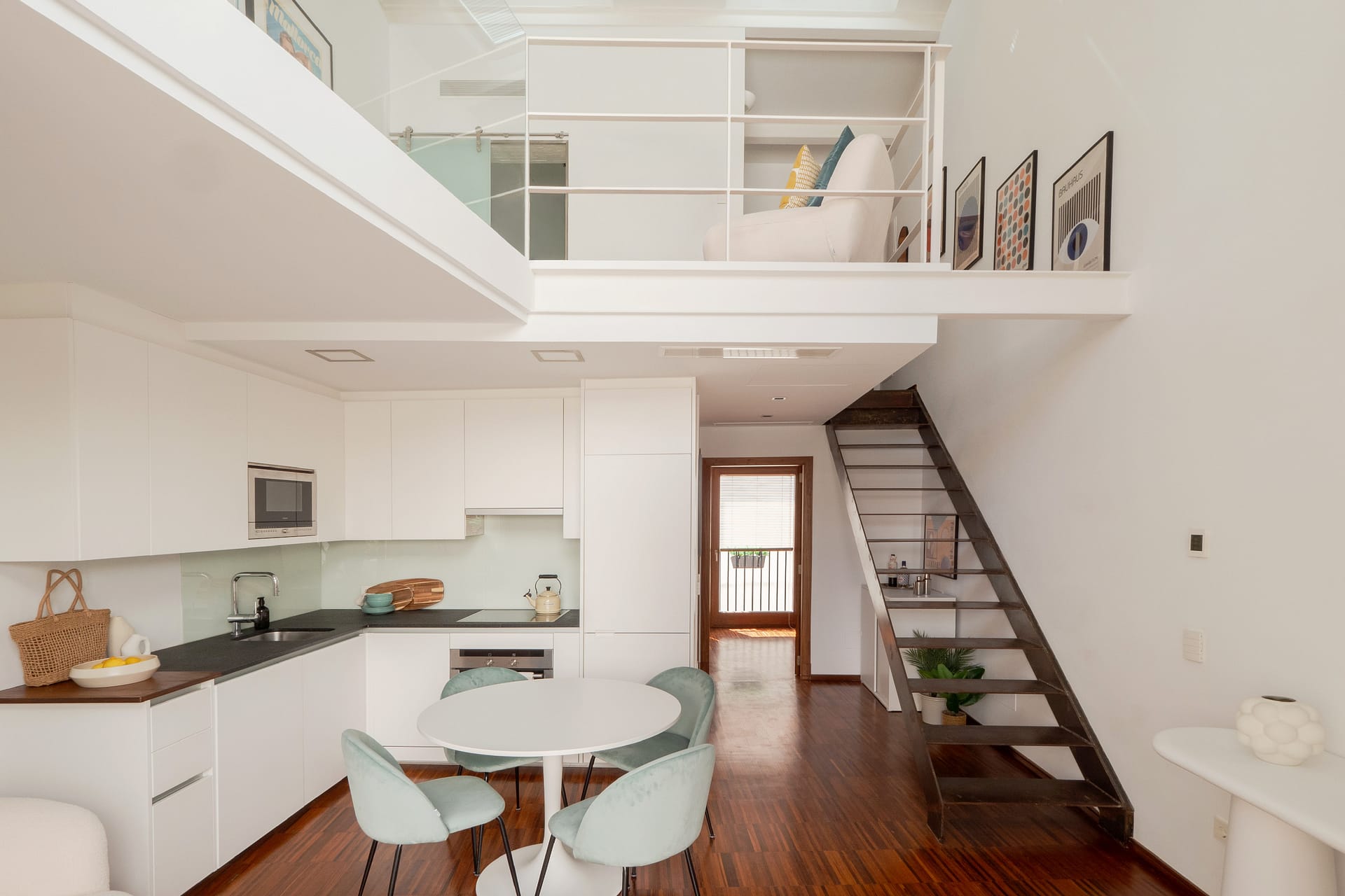 The main floor features an open-plan living, dining, and kitchen area suited for both everyday living and entertaining. The living space connects directly to a private terrace of approximately 24 m² — a rare outdoor space in this central location.
