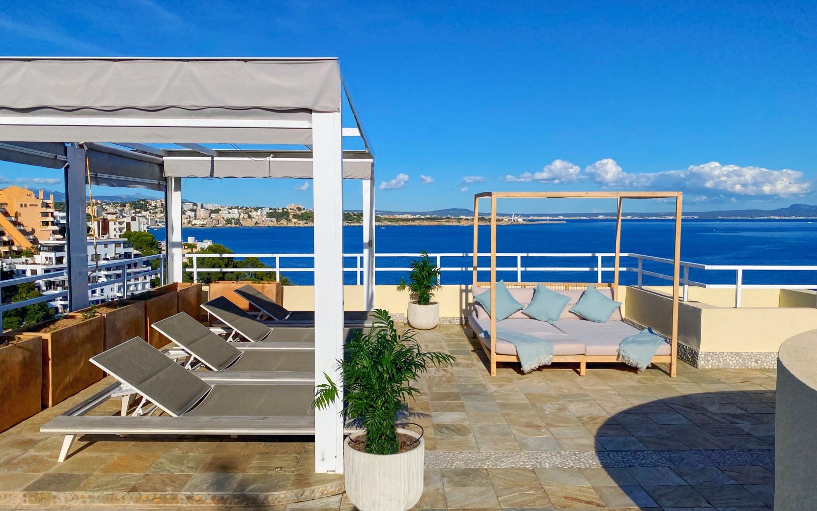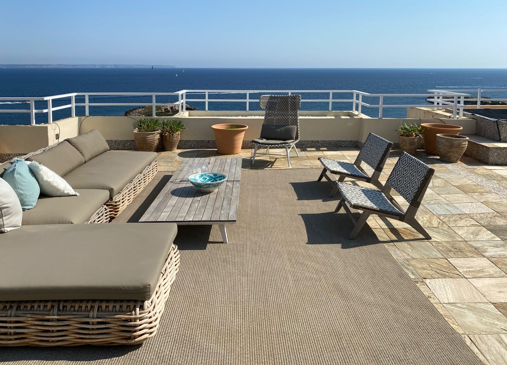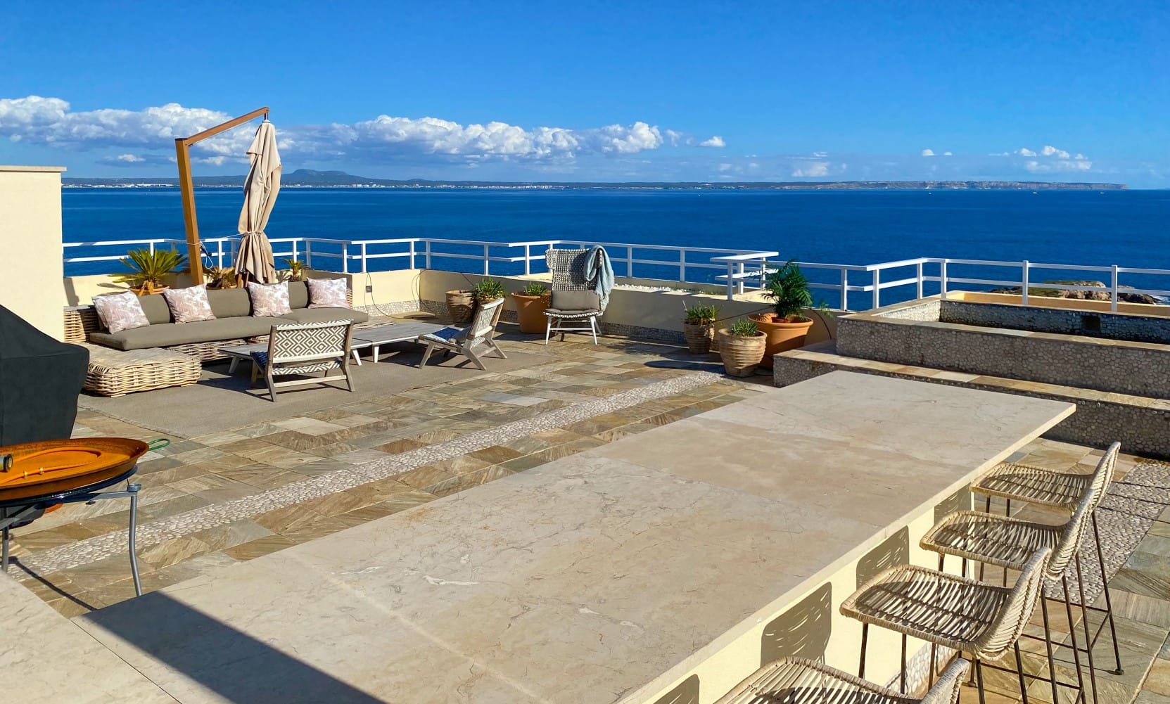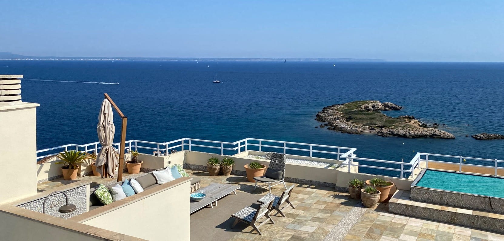 This outstanding penthouse is situated in an elegant and residential development located in Illetas where you can enjoy a very spacious terrace with breathtaking panoramic sea views to the Bay of Palma. The property consists of a community pool and gardens; it is close to many amenities and is walking distance to many beautiful sandy beaches. As you walk into the penthouse you find yourself in a beautiful entrance which leads to a spacious living room, dining area and a well-equipped open plan kitchen. The outstanding seaviews are seen from every corner of the apartment which leads us out to the incredible terrace. This state-of-the art 300m2 outdoor terrace has a lounge area, dining area, summer outdoor kitchen with a bar and an infinity plunge pool with a large sun bathing area.