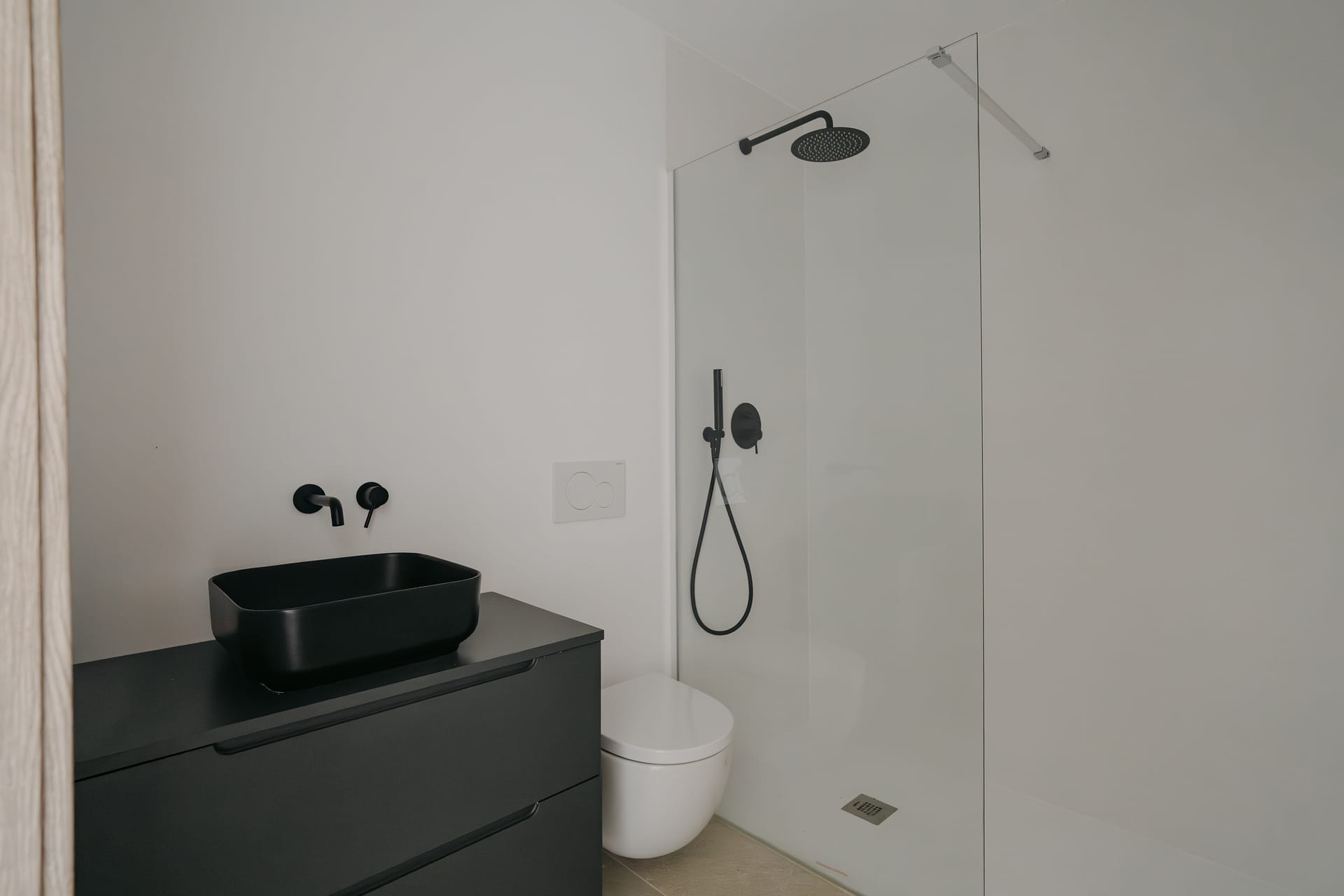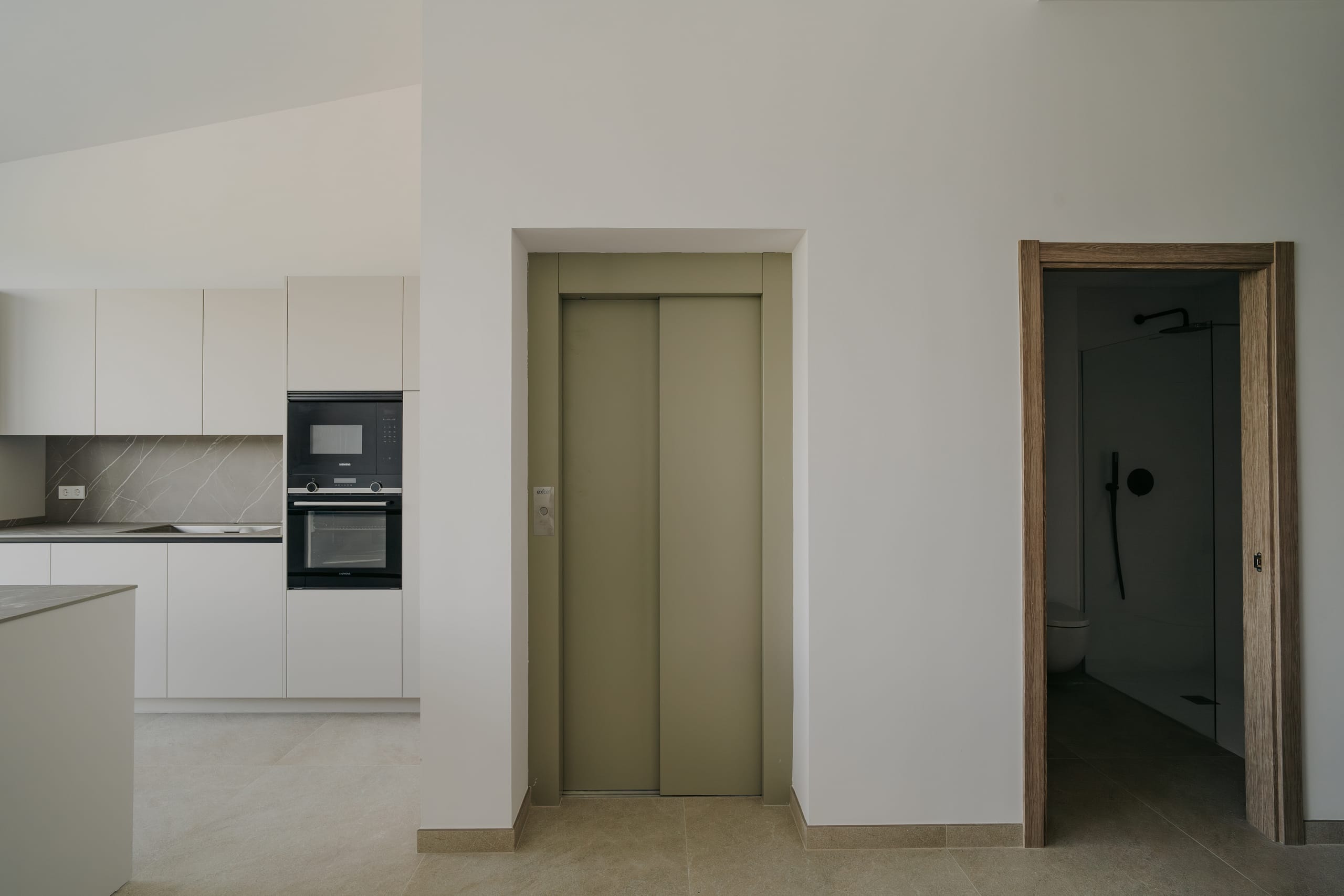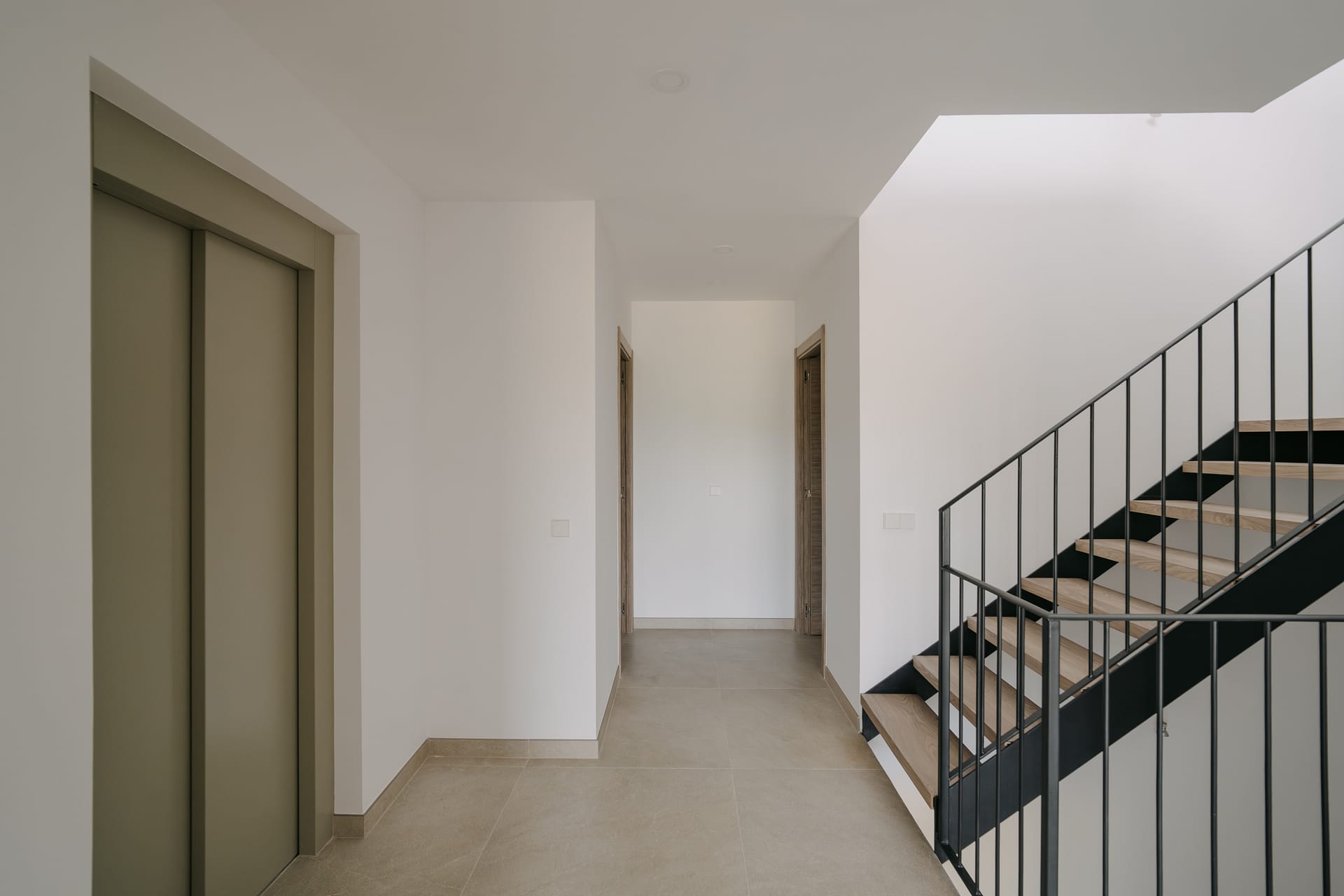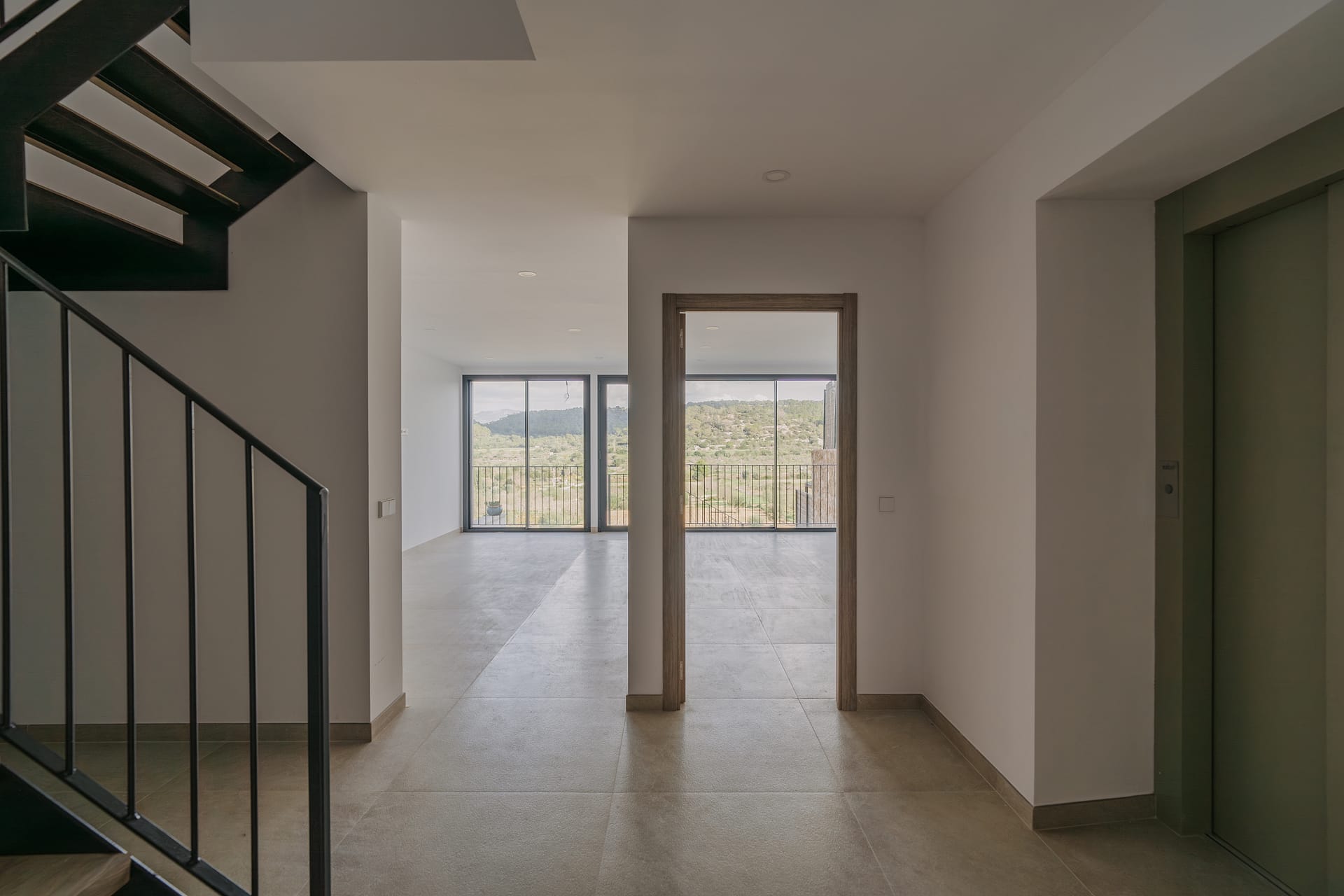 This contemporary semi-detached house offers approximately 200m2 of interior living space arranged over several levels, all connected by an elevator. The property comprises three bedrooms and three bathrooms, including one en-suite, generous terraces with open north-facing views, and a covered parking area with direct access to the house.