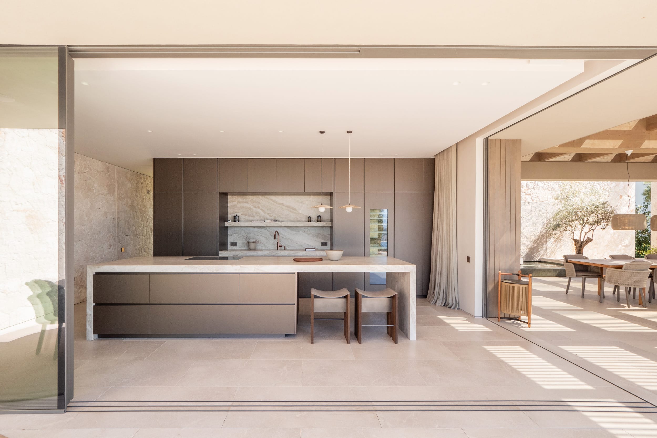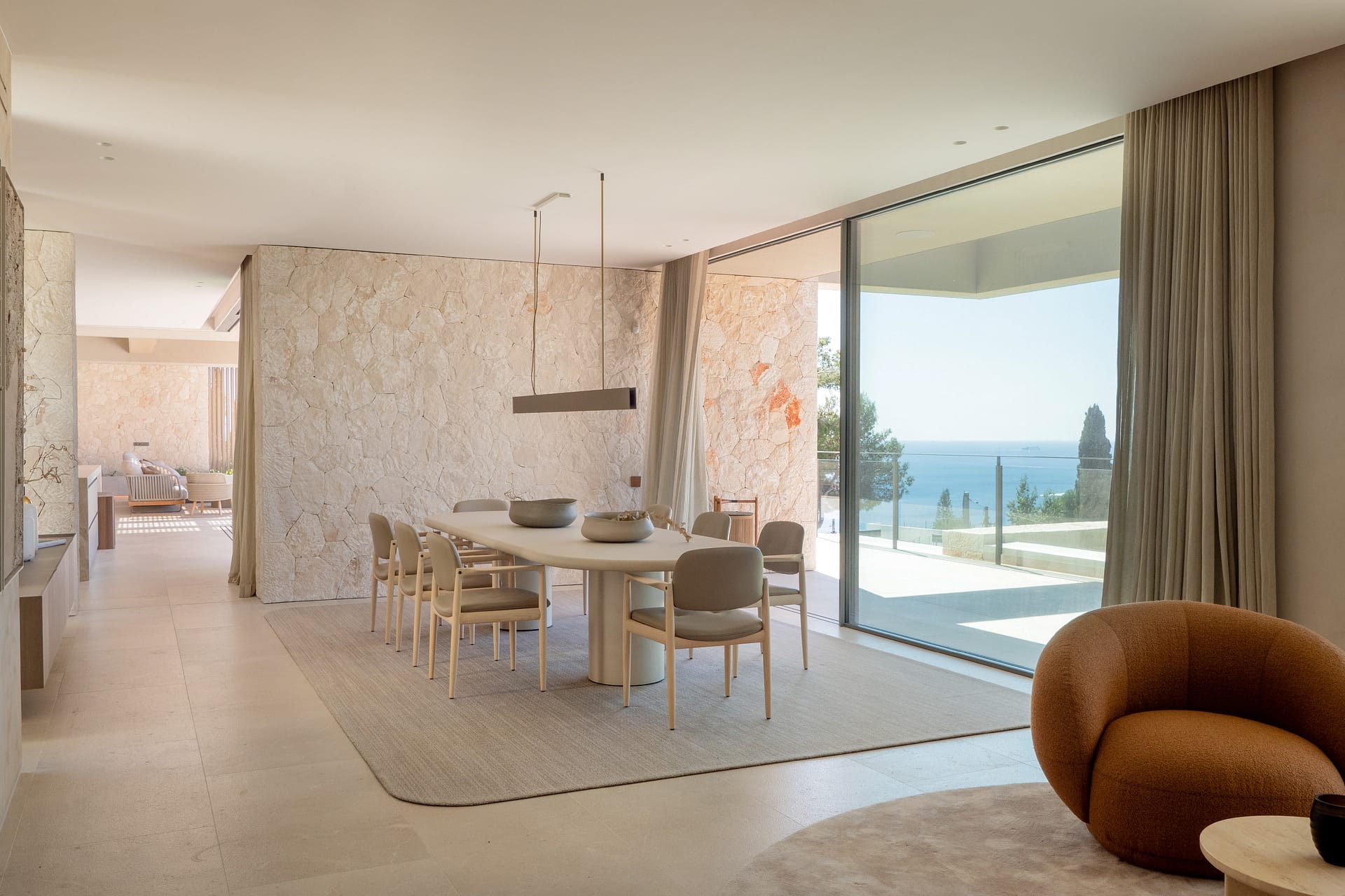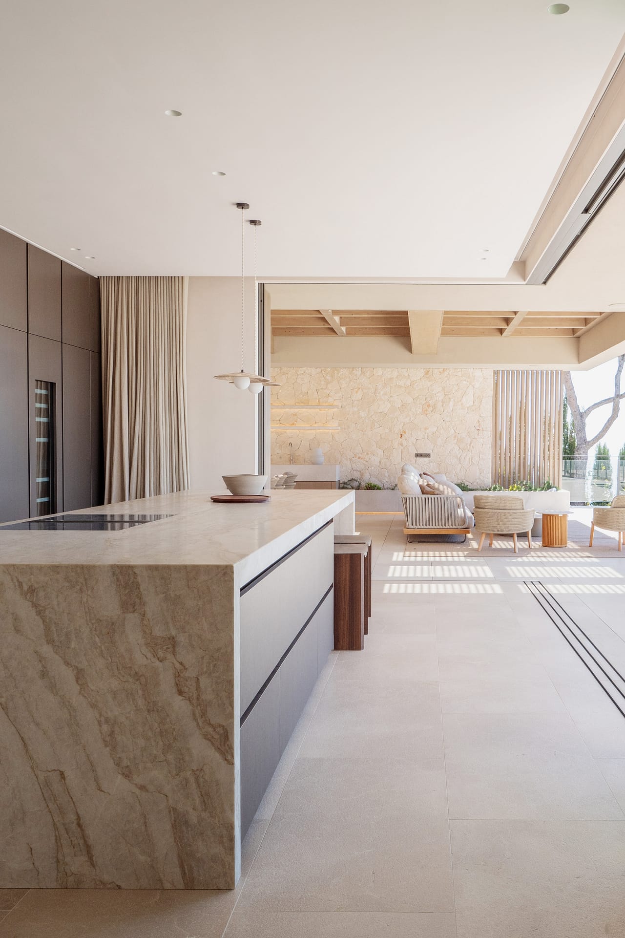 The top floor is centred around the main living spaces and the master suite. The bedroom includes a walk-in wardrobe, an en suite bathroom, and direct access to a private terrace with open sea views. The living and dining area connects to a Poliform kitchen, supported by a separate preparation kitchen. Large sliding doors open onto a spacious terrace, creating a seamless indoor-outdoor layout suited to both daily living and entertaining.