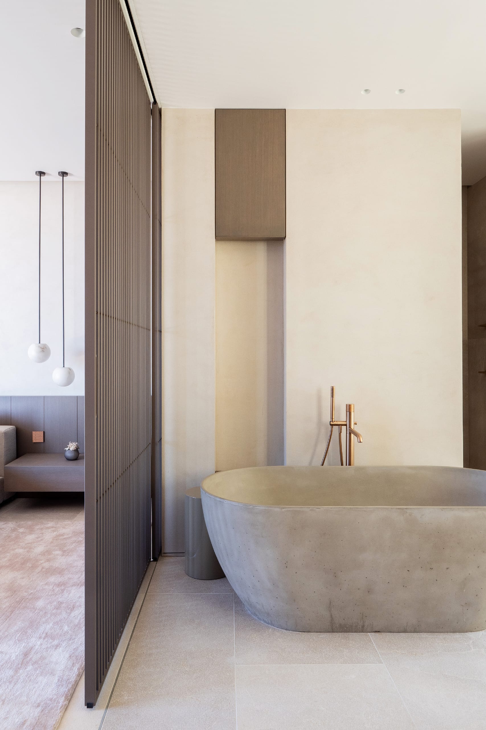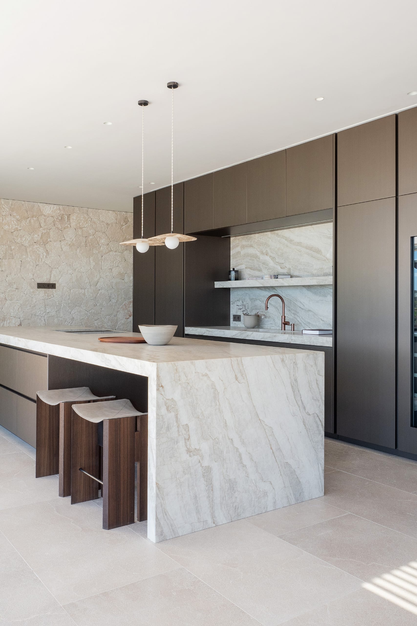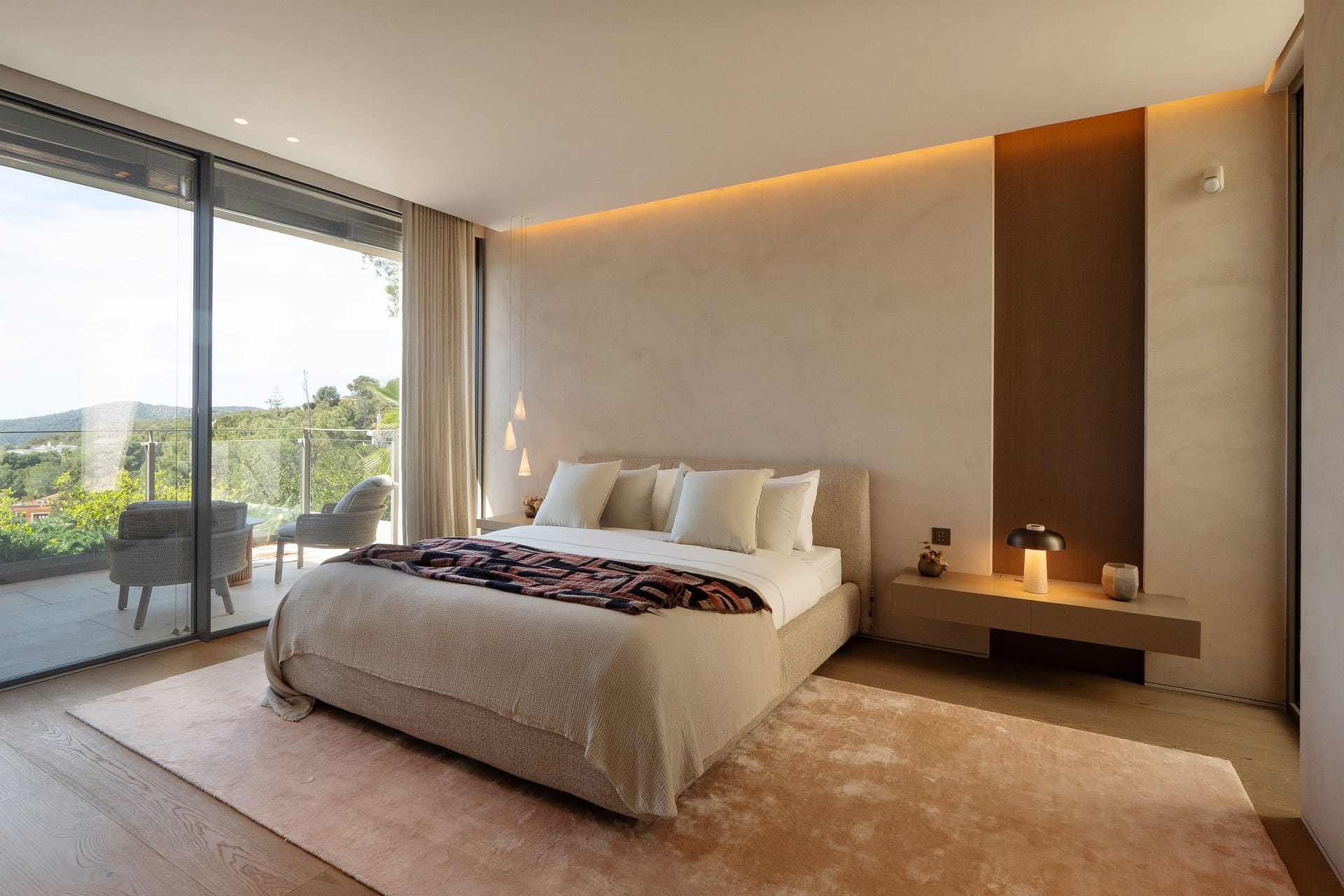 The top floor is centred around the main living spaces and the master suite. The bedroom includes a walk-in wardrobe, an en suite bathroom, and direct access to a private terrace with open sea views. The living and dining area connects to a Poliform kitchen, supported by a separate preparation kitchen. Large sliding doors open onto a spacious terrace, creating a seamless indoor-outdoor layout suited to both daily living and entertaining.