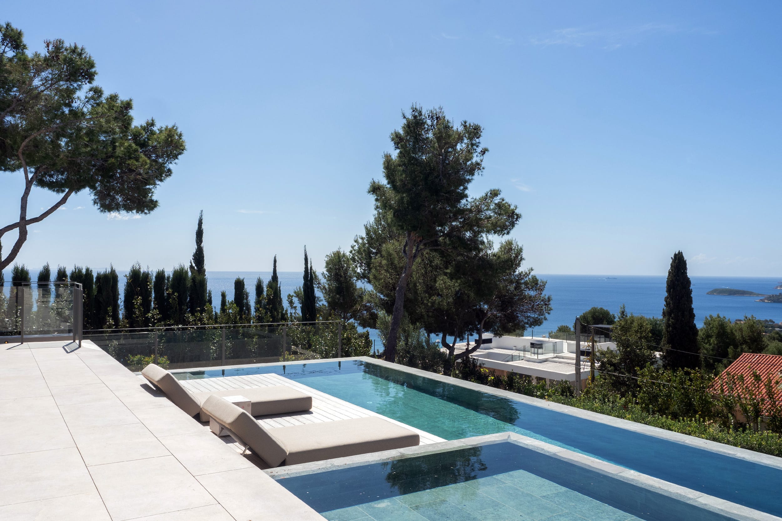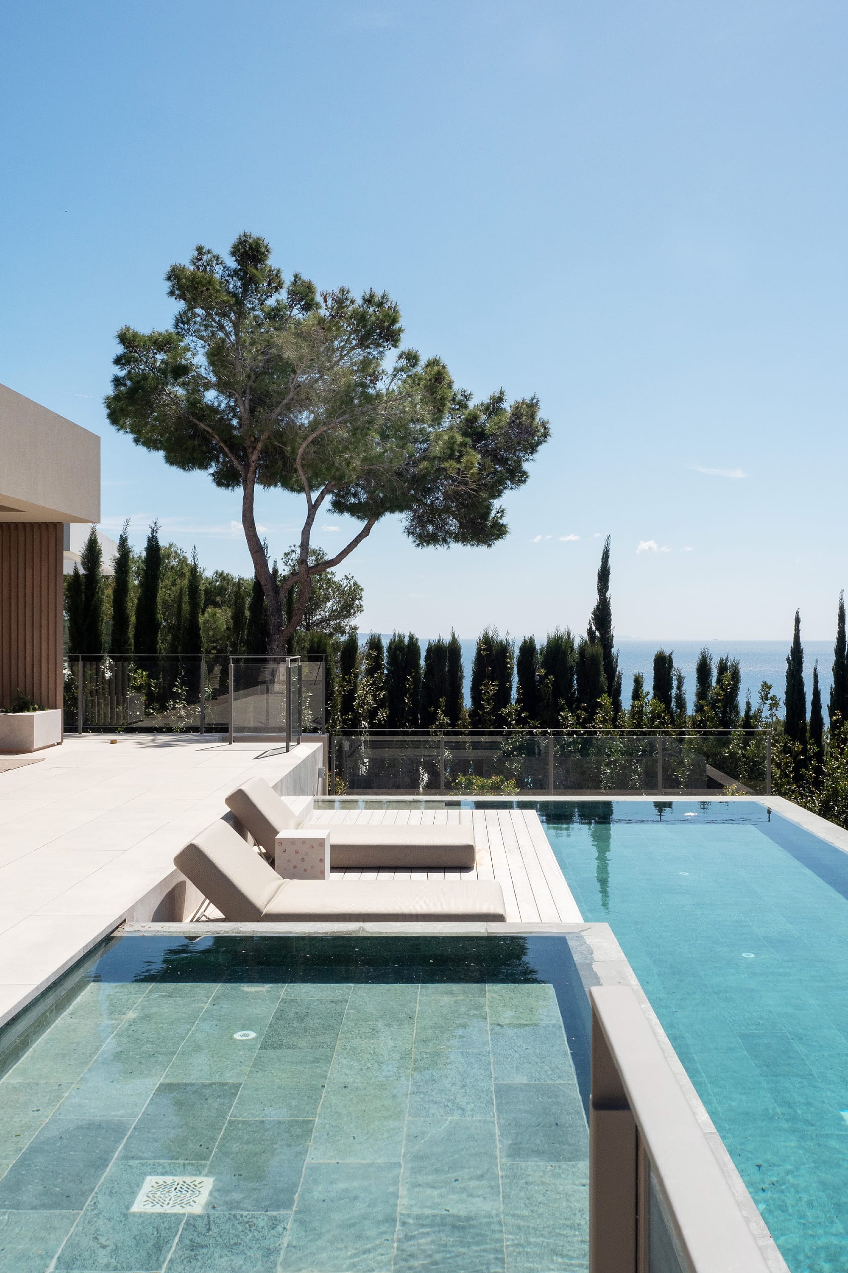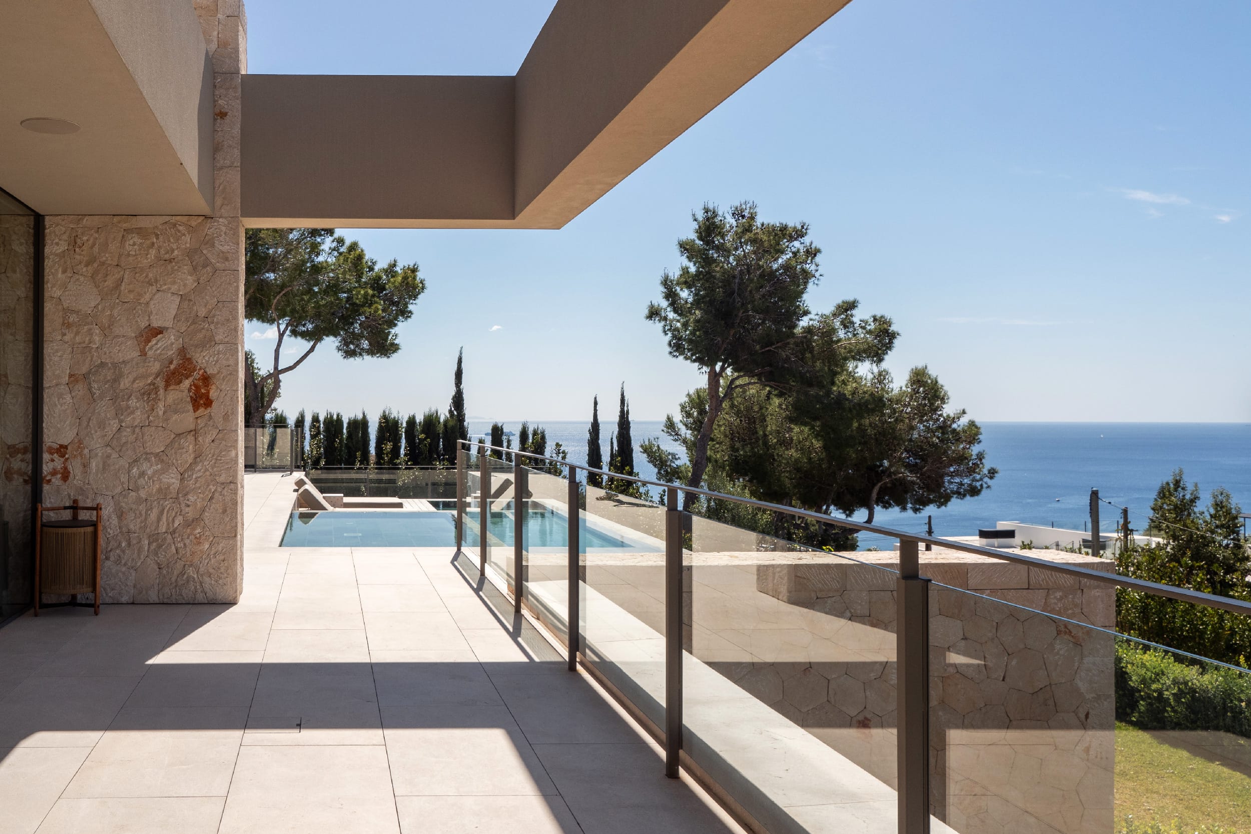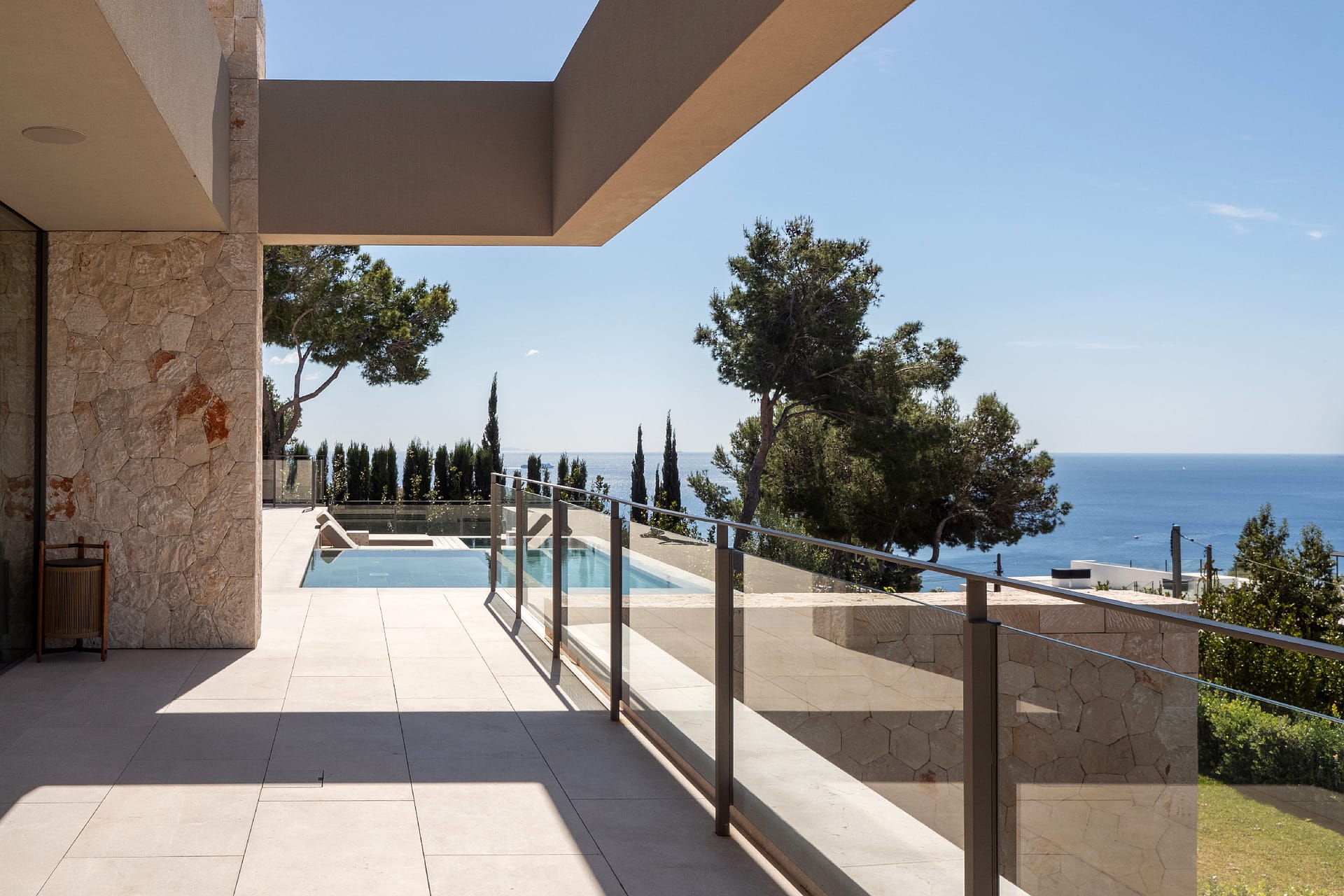 The outdoor areas are designed for both relaxation and activity. Two swimming pools provide flexibility, whether for training or leisure. Wide terraces, covered dining spaces, and a built-in fireplace create a clean, Mediterranean setting with a strong architectural feel. Mature landscaping and the elevated position ensure privacy throughout, with open views from every angle.