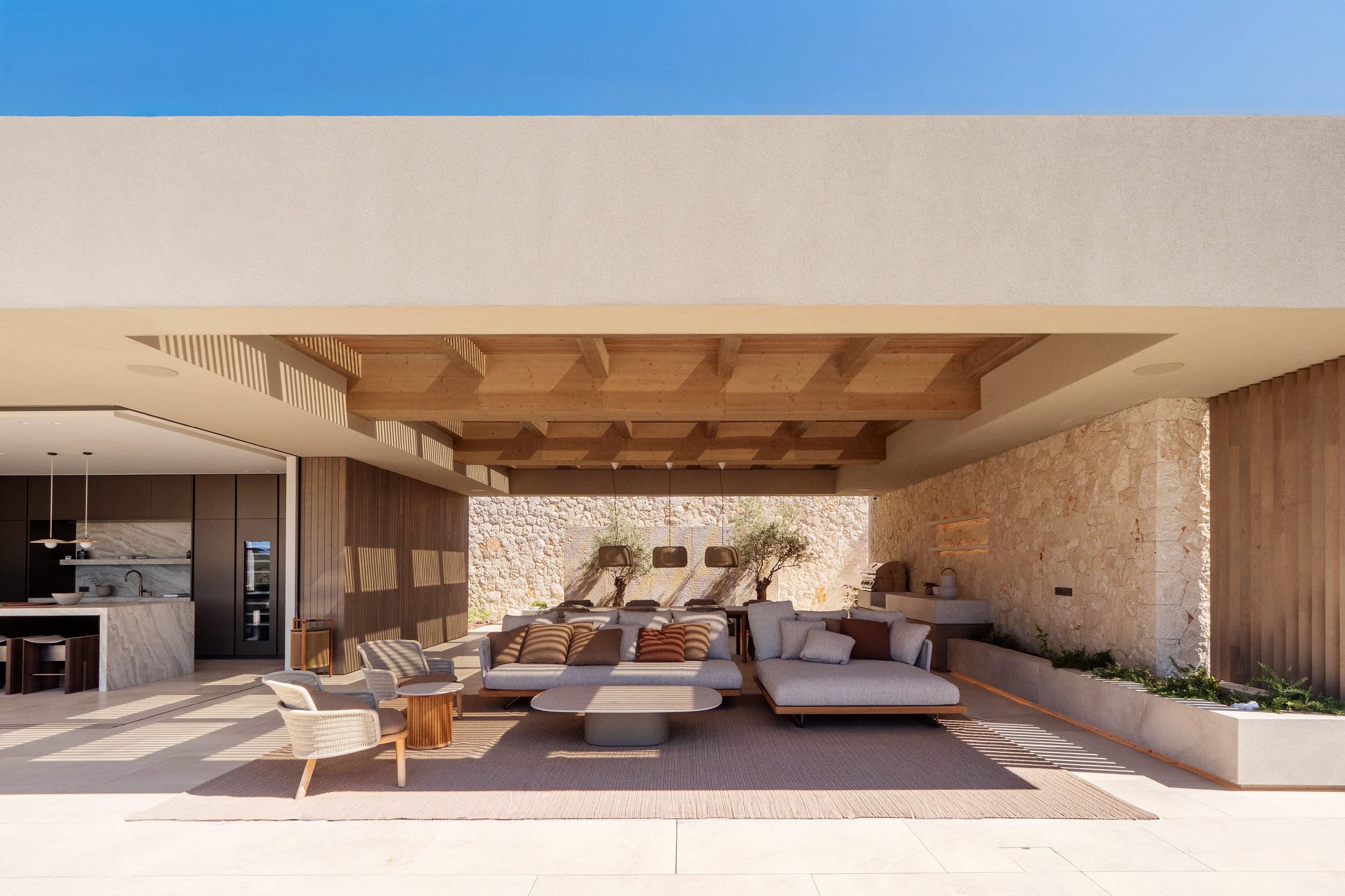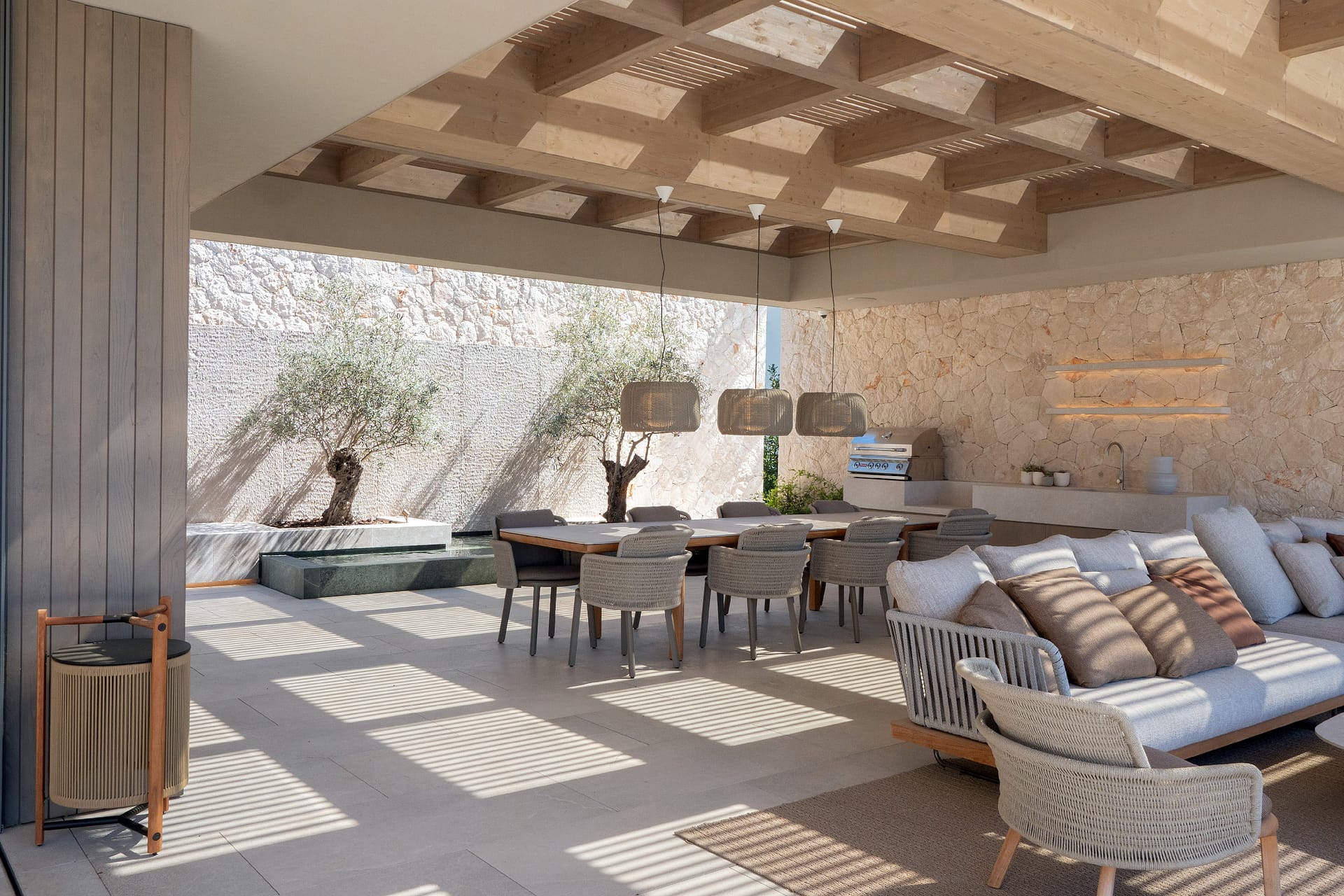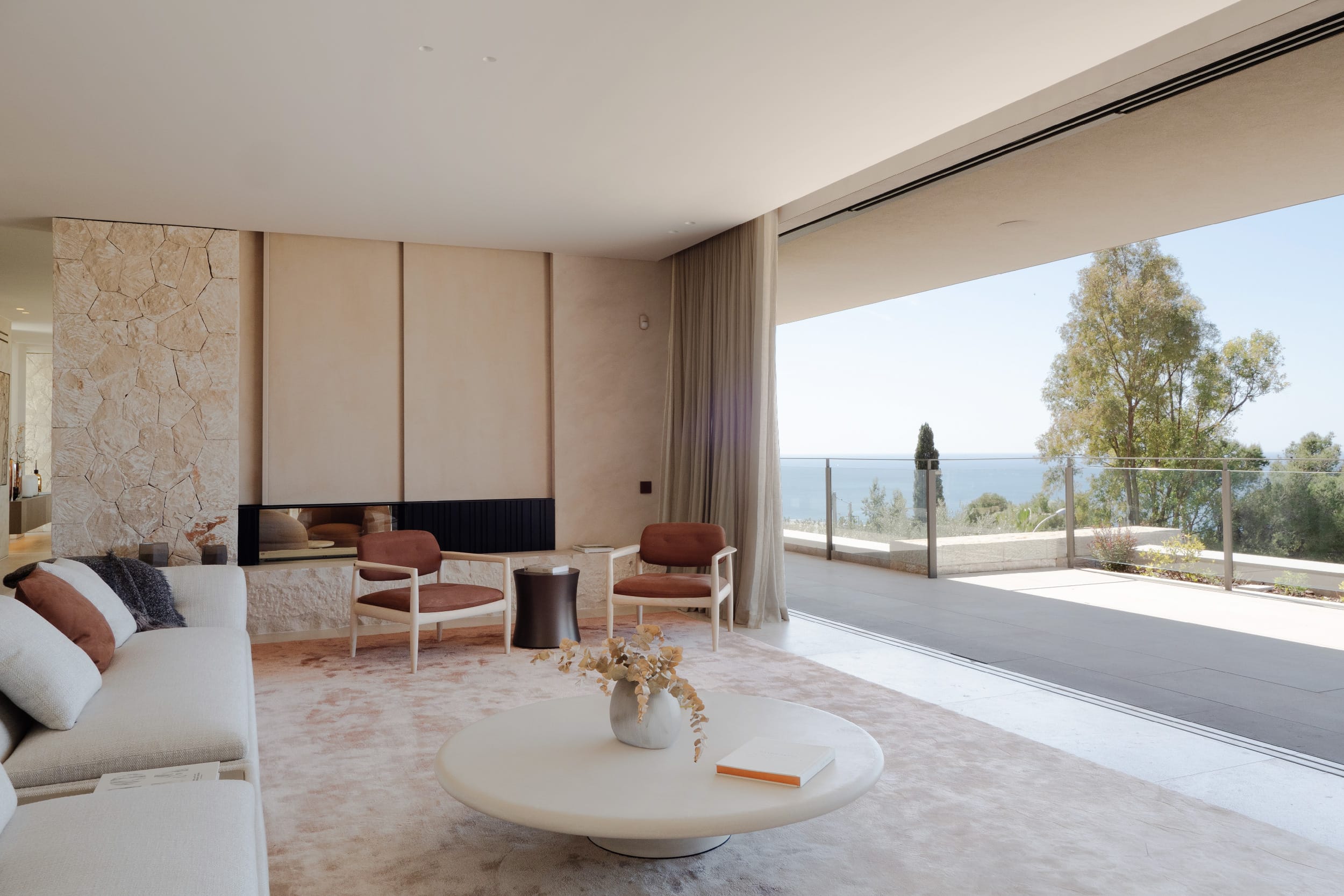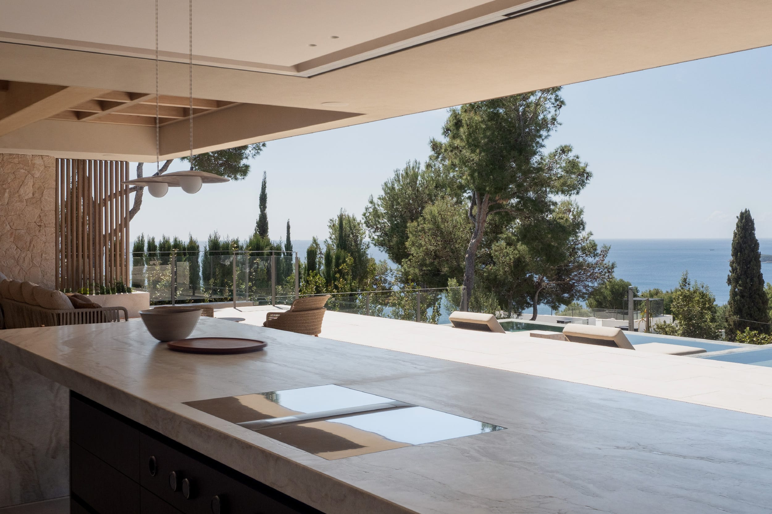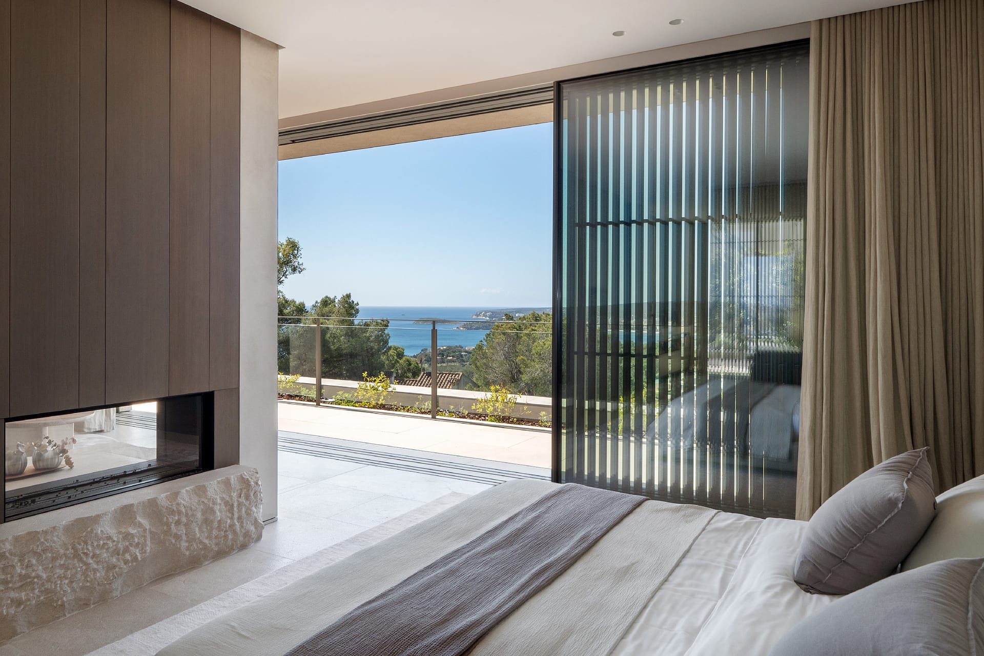The outdoor areas are designed for both relaxation and activity. Two swimming pools provide flexibility, whether for training or leisure. Wide terraces, covered dining spaces, and a built-in fireplace create a clean, Mediterranean setting with a strong architectural feel. Mature landscaping and the elevated position ensure privacy throughout, with open views from every angle.