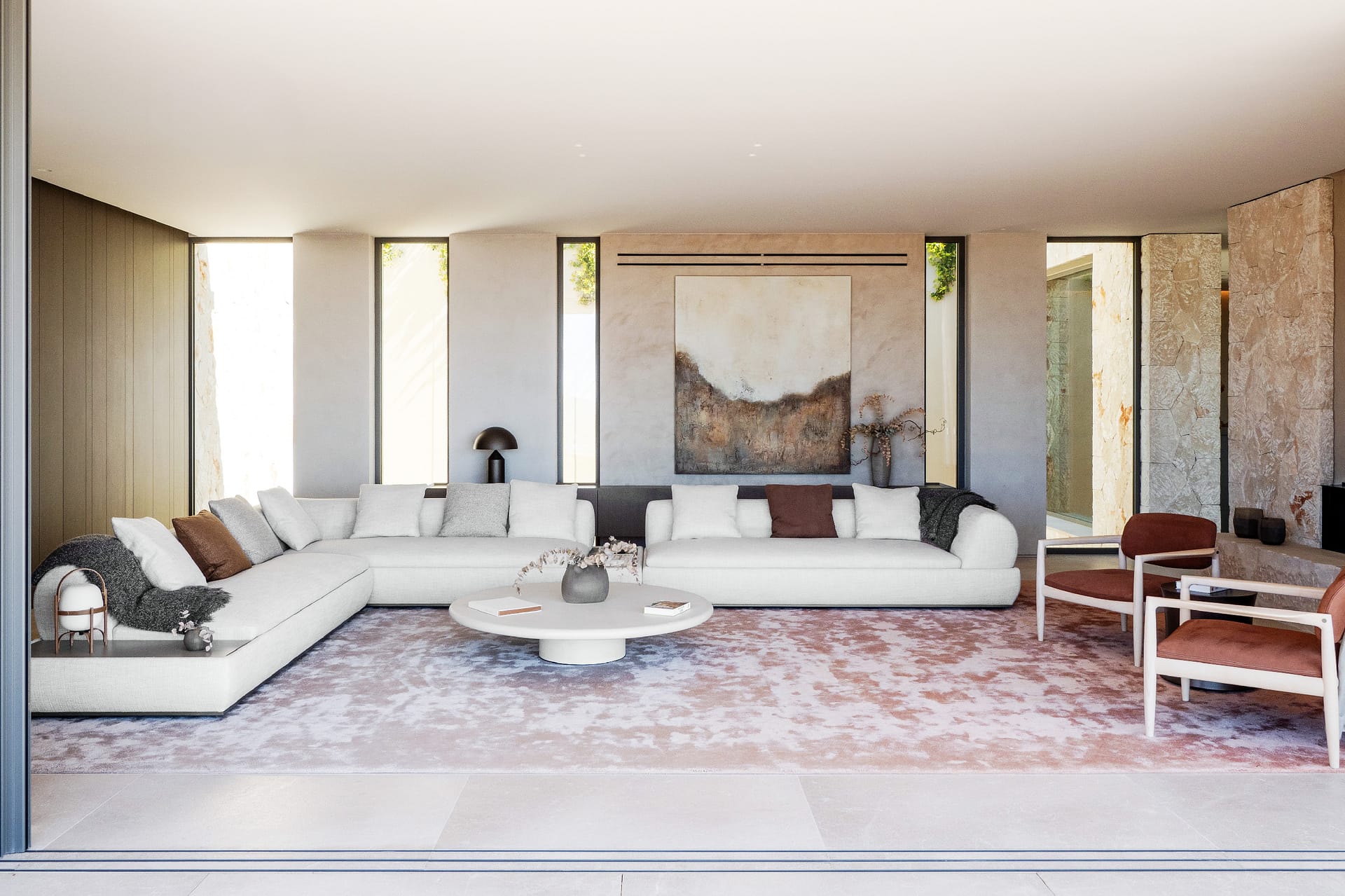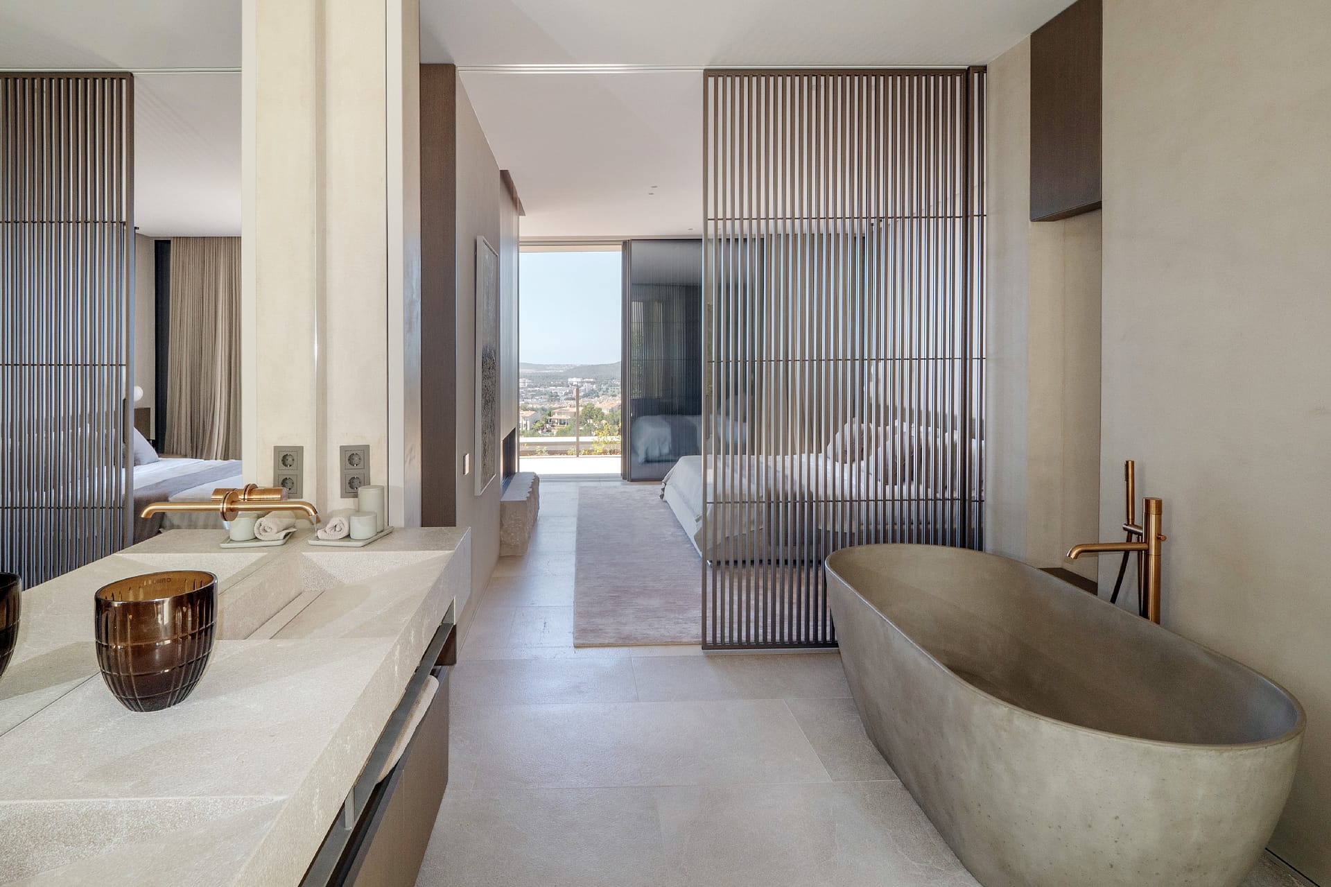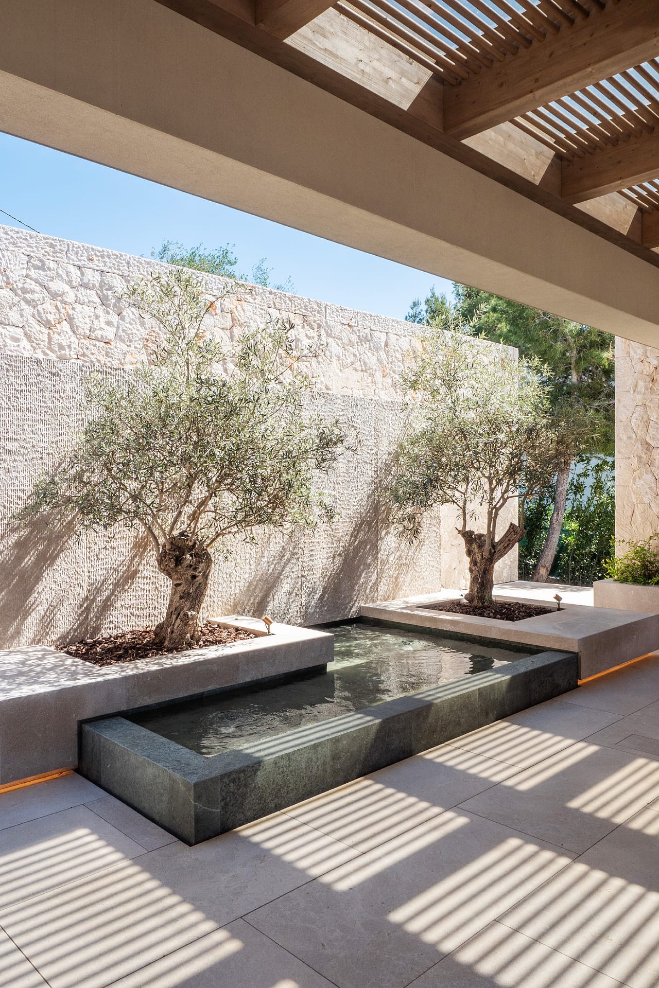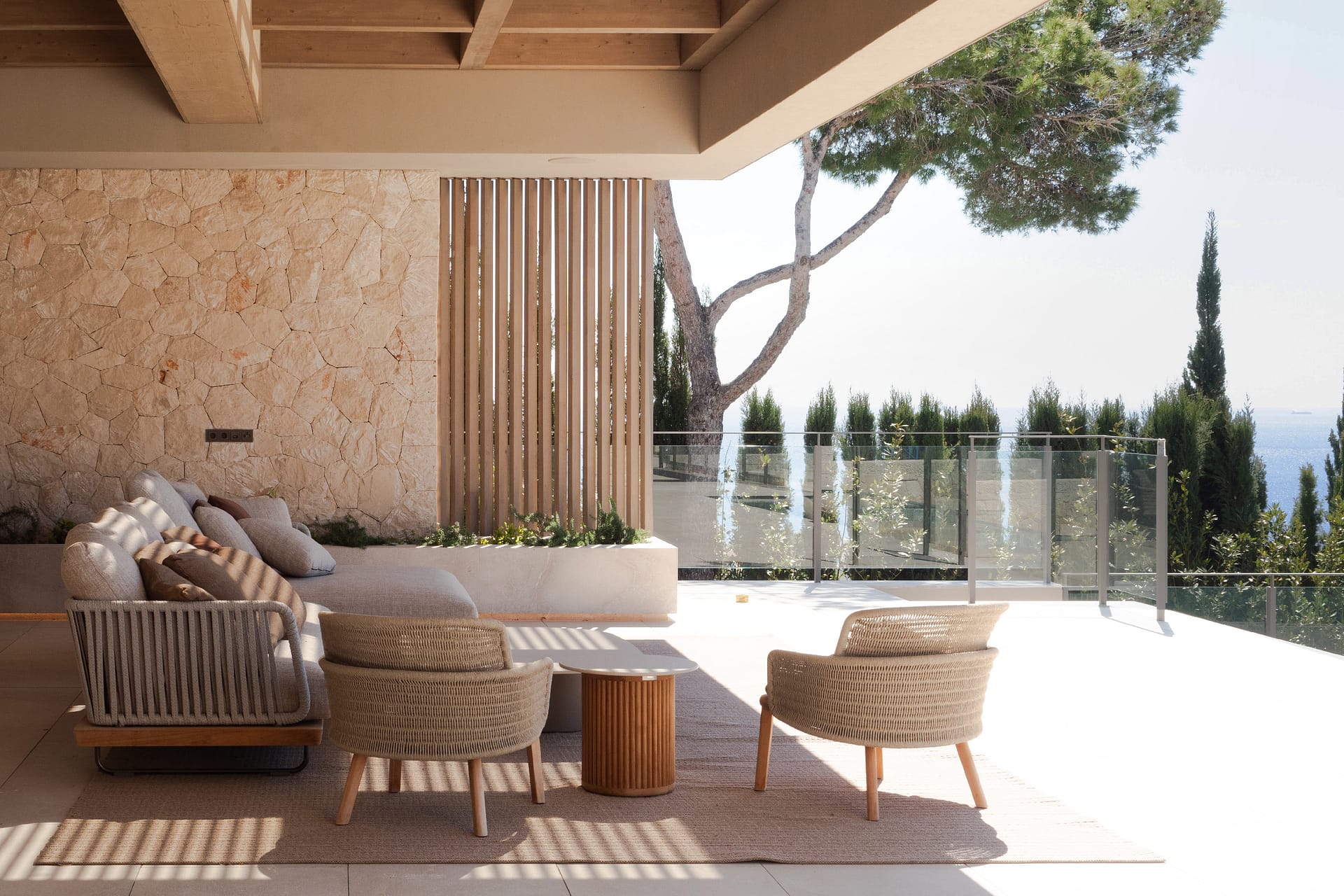 The outdoor areas are designed for both relaxation and activity. Two swimming pools provide flexibility, whether for training or leisure. Wide terraces, covered dining spaces, and a built-in fireplace create a clean, Mediterranean setting with a strong architectural feel. Mature landscaping and the elevated position ensure privacy throughout, with open views from every angle.