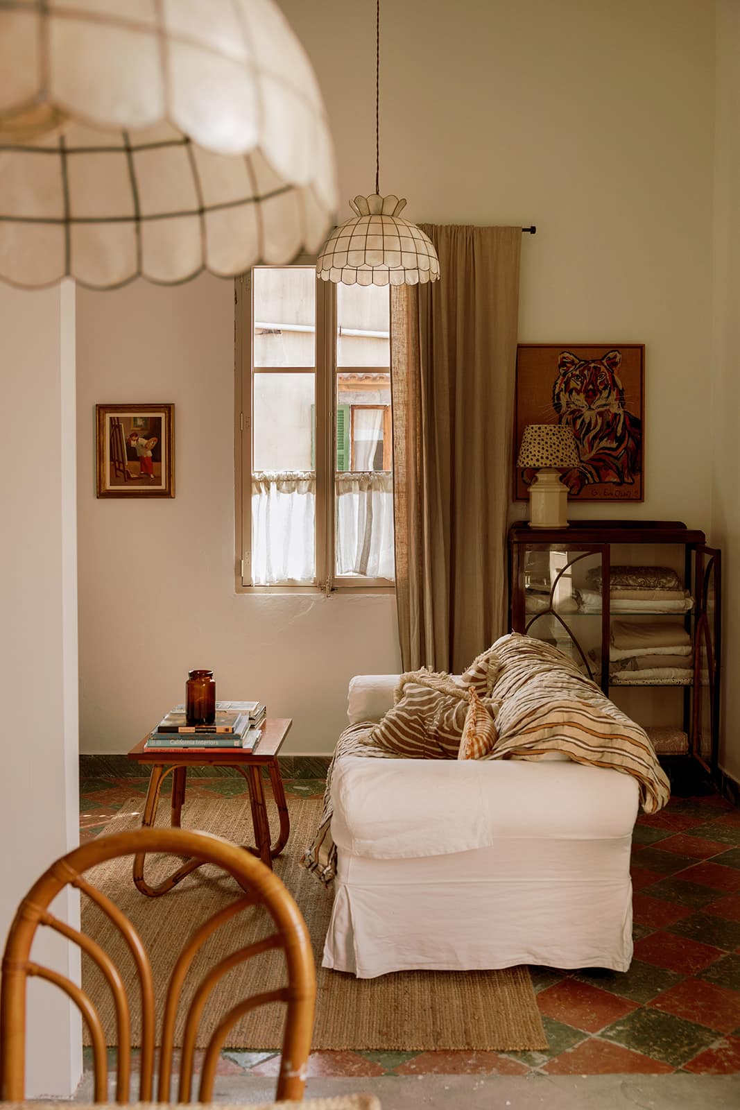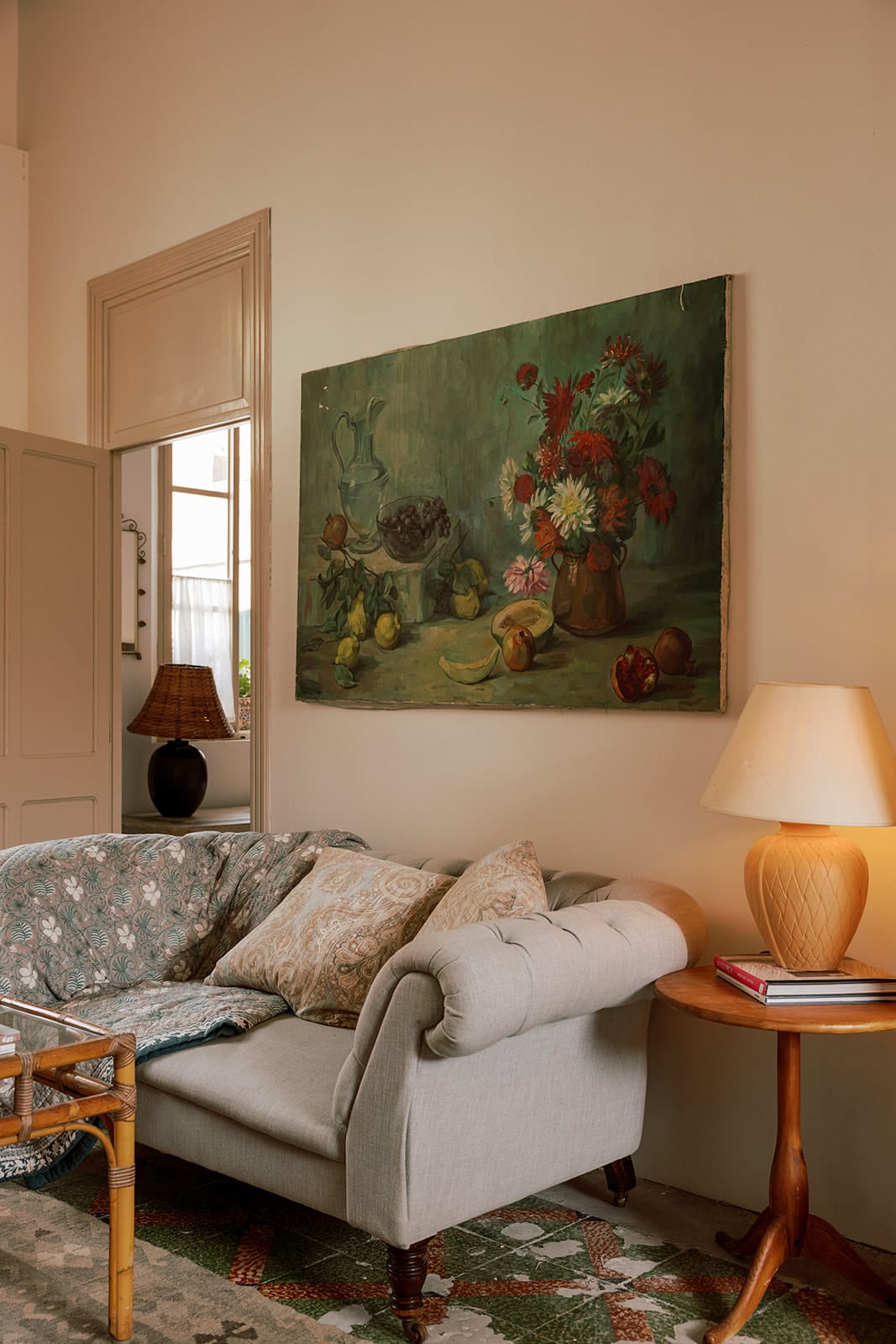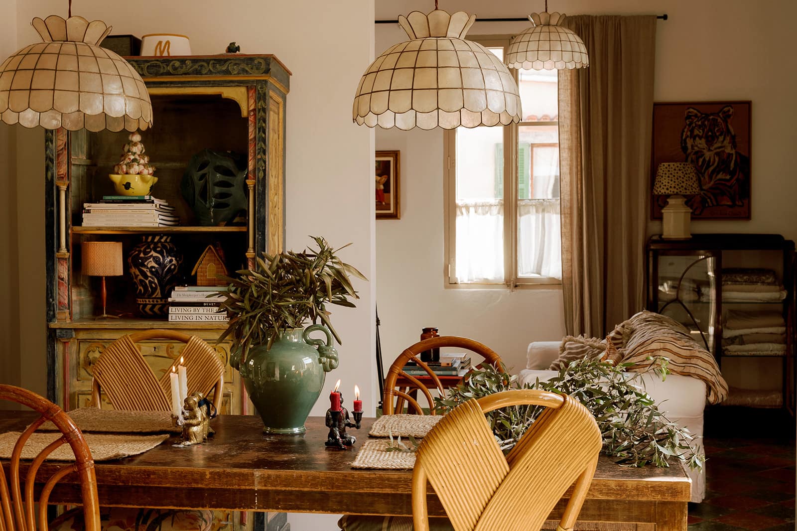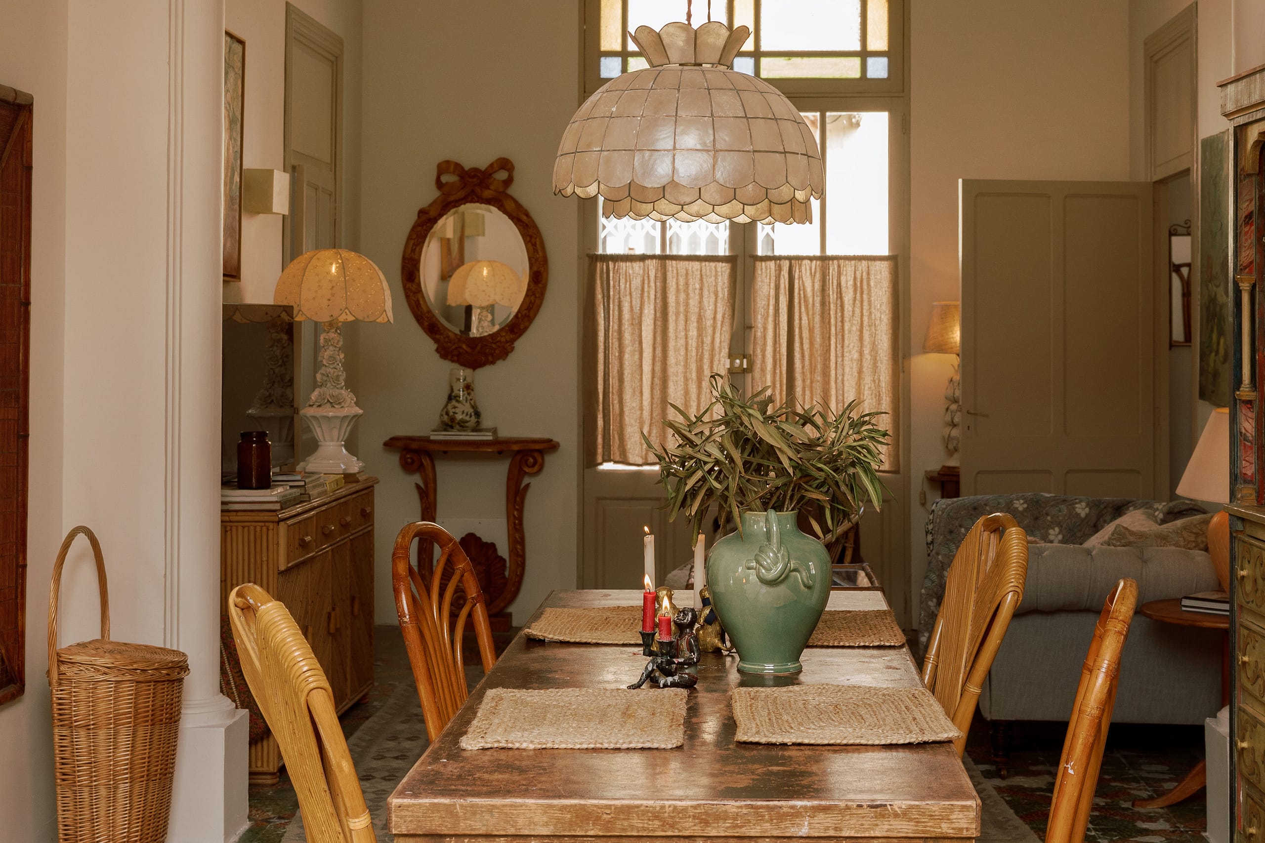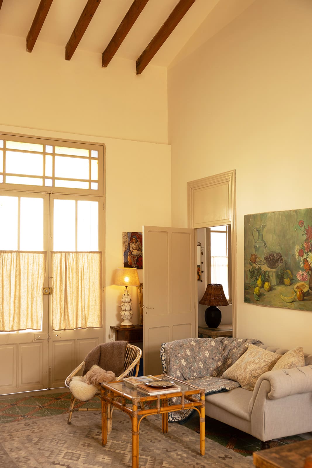 The main living area is arranged as an open kitchen, dining, and lounge space, where original hydraulic tiles, exposed wooden beams, and soft natural tones create a calm and authentic setting. Preserved architectural details, handcrafted elements, and custom finishes give the home a timeless and personal character, while large openings towards the patio allow light and air to circulate throughout the house.