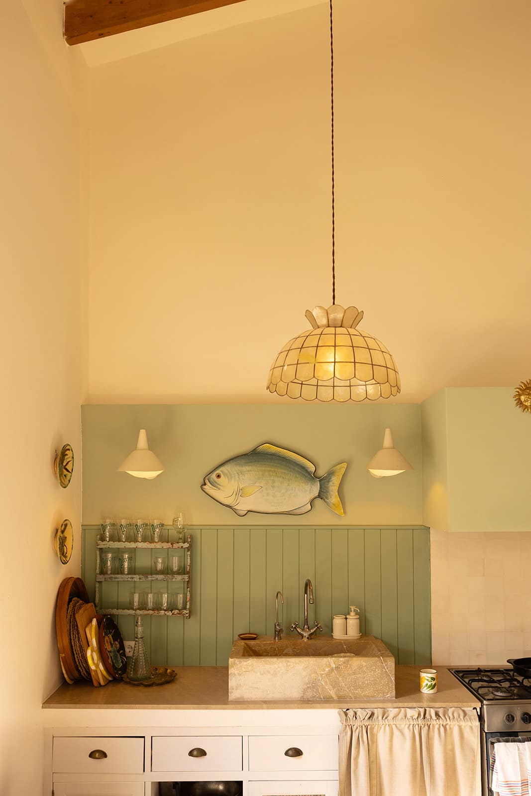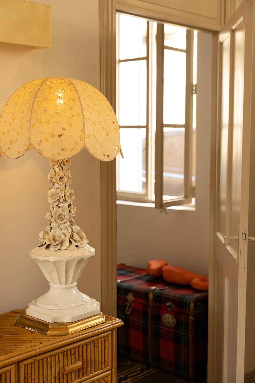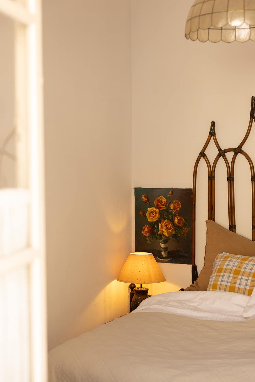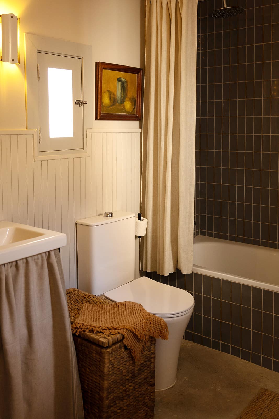 The main living area is arranged as an open kitchen, dining, and lounge space, where original hydraulic tiles, exposed wooden beams, and soft natural tones create a calm and authentic setting. Preserved architectural details, handcrafted elements, and custom finishes give the home a timeless and personal character, while large openings towards the patio allow light and air to circulate throughout the house.