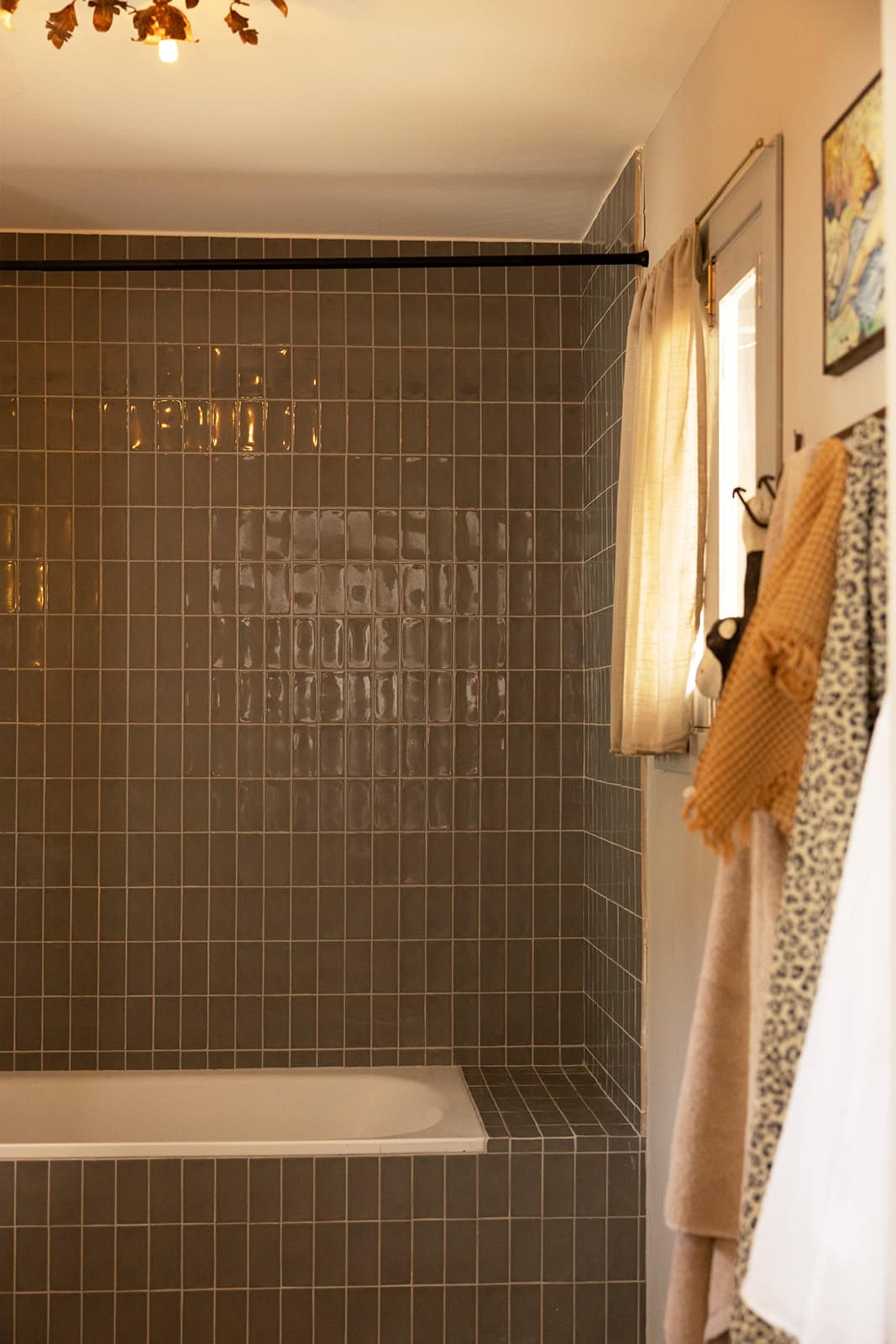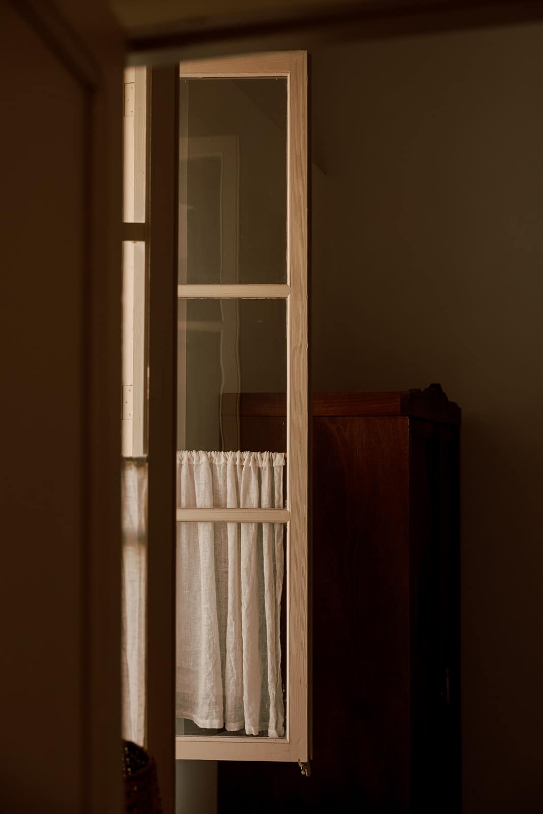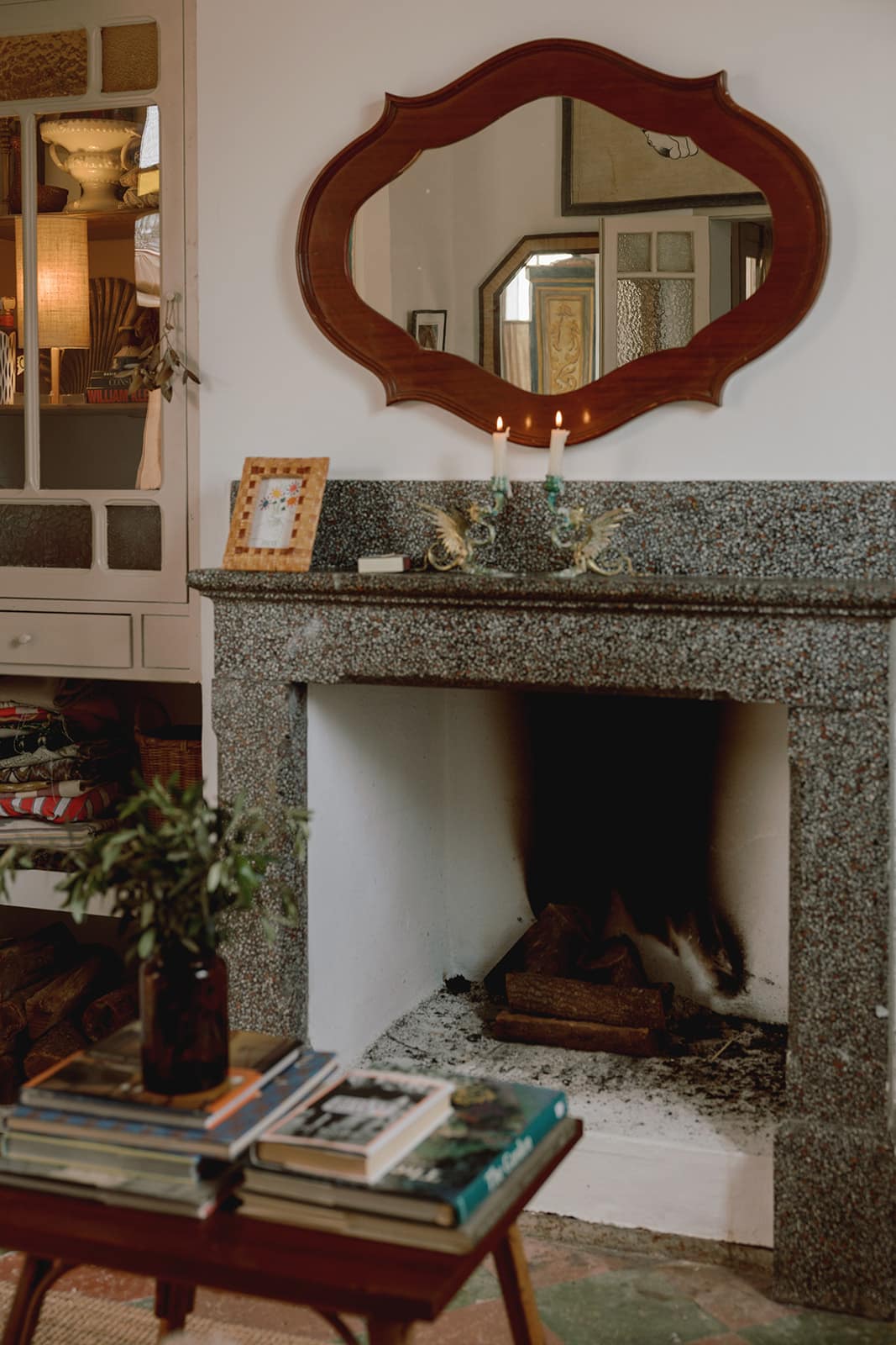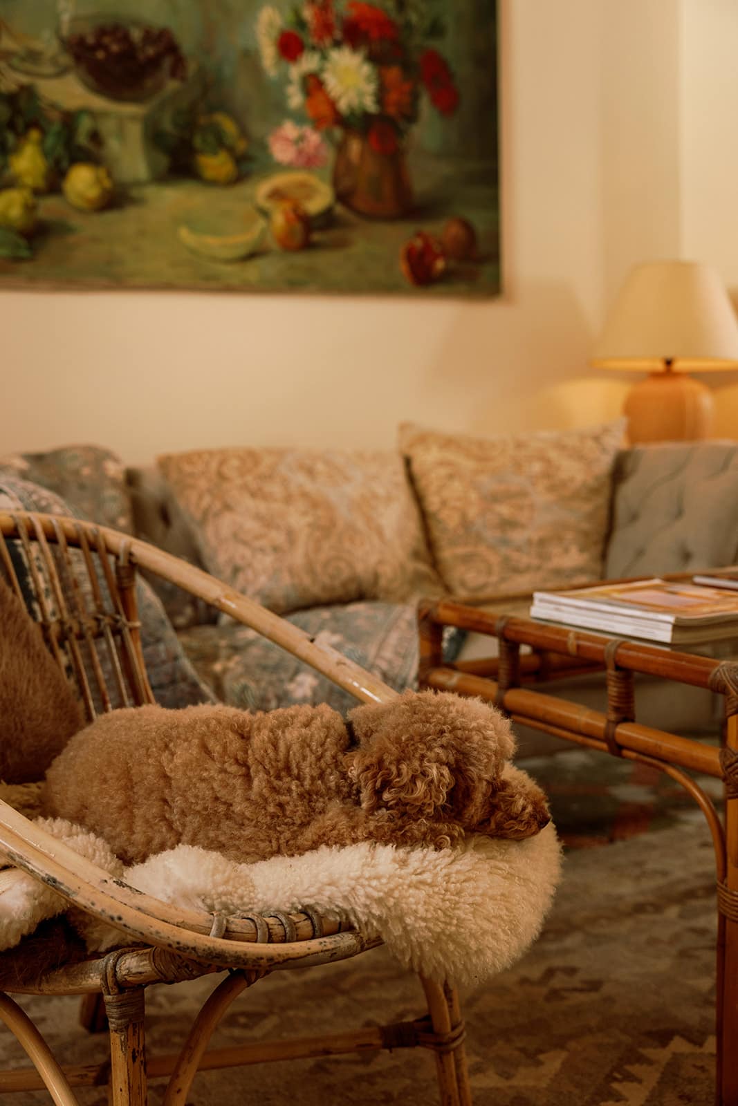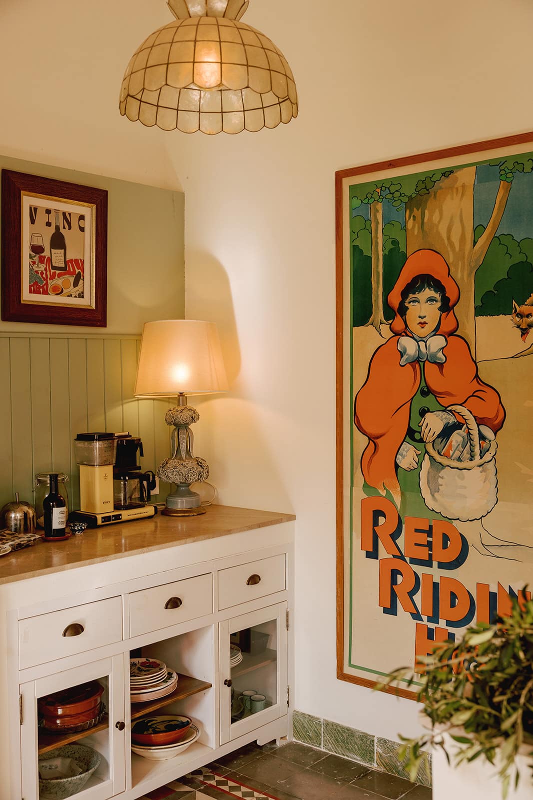 The main living area is arranged as an open kitchen, dining, and lounge space, where original hydraulic tiles, exposed wooden beams, and soft natural tones create a calm and authentic setting. Preserved architectural details, handcrafted elements, and custom finishes give the home a timeless and personal character, while large openings towards the patio allow light and air to circulate throughout the house.