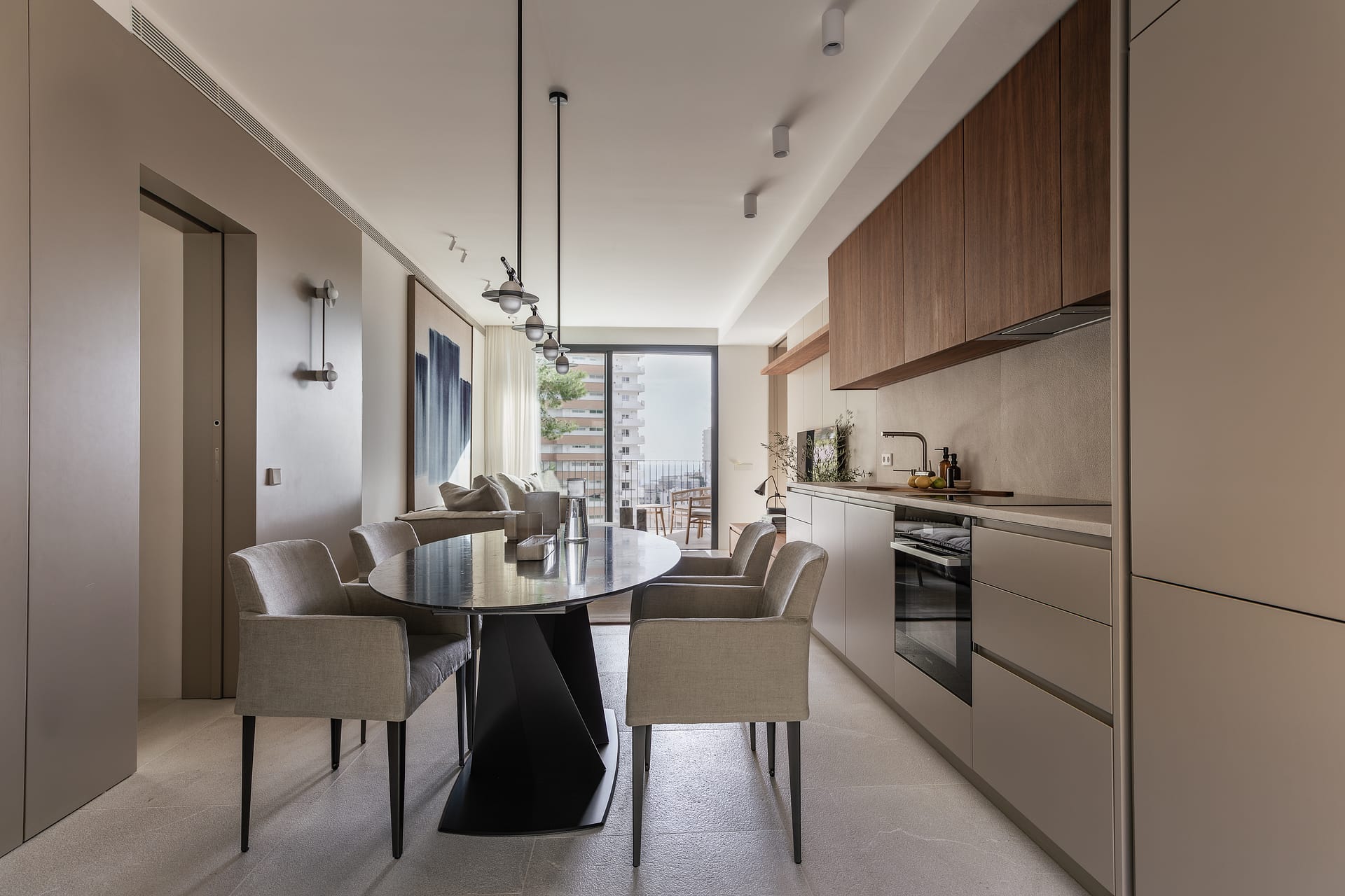 Two elegant bedrooms and two bathrooms provide comfort and privacy, including a master suite with an en-suite bathroom. The interiors are delivered fully furnished, with carefully selected Italian pieces by Barzaghi Salotti and Ethimo, paired with bespoke carpentry handcrafted by Mallorcan artisans. Premium Miele appliances, LG televisions, and a Bang & Olufsen sound system complete the experience with understated luxury.