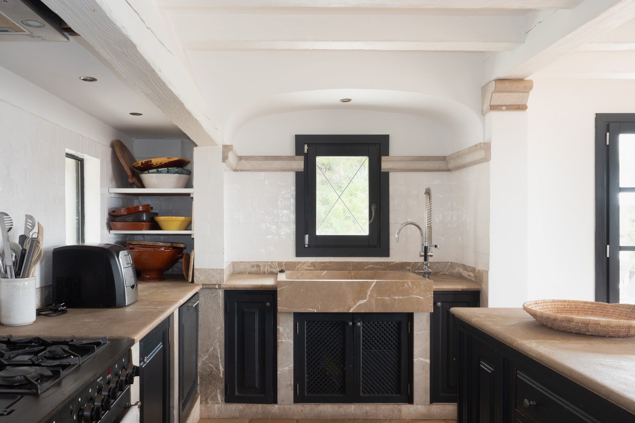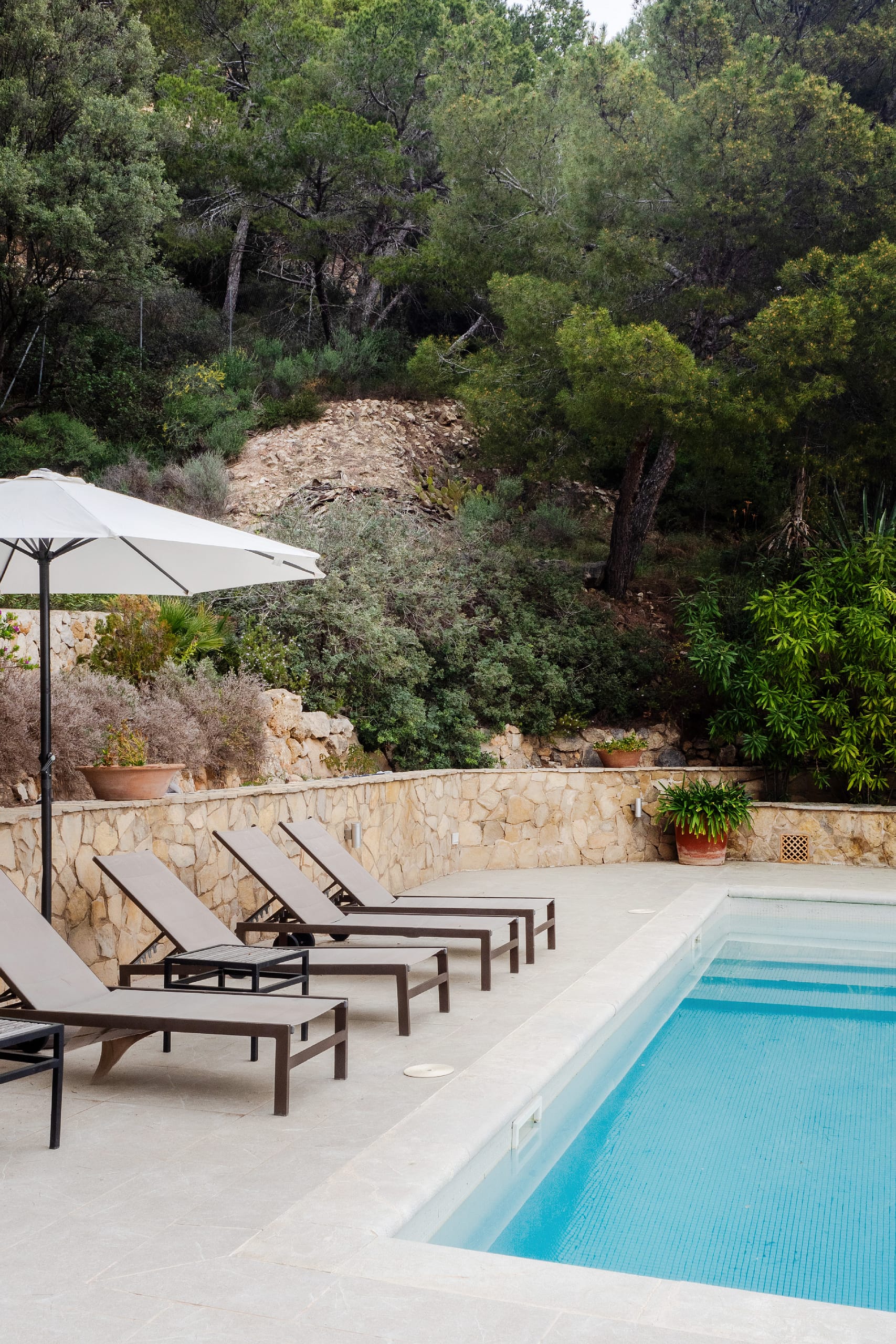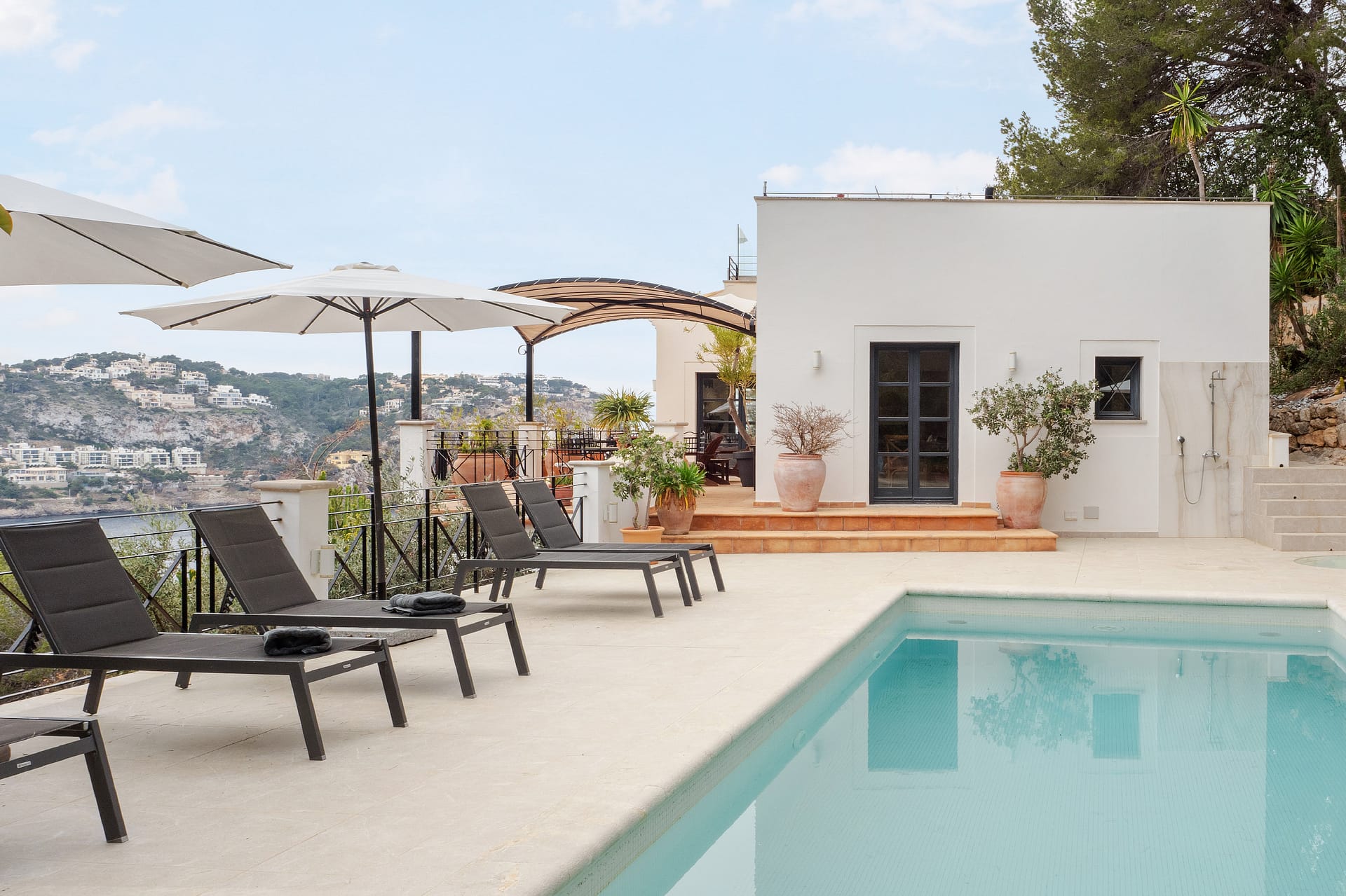 At the heart of the villa is a bespoke, fully fitted kitchen with direct access to the generous pool area. This inviting outdoor space is perfect for entertaining and relaxing alike, with multiple seating areas spread across the terraces, ideal for long lunches, sunset dinners, or quiet moments in the shade. The swimming pool is complemented by a jacuzzi, adding a touch of luxury to everyday life.