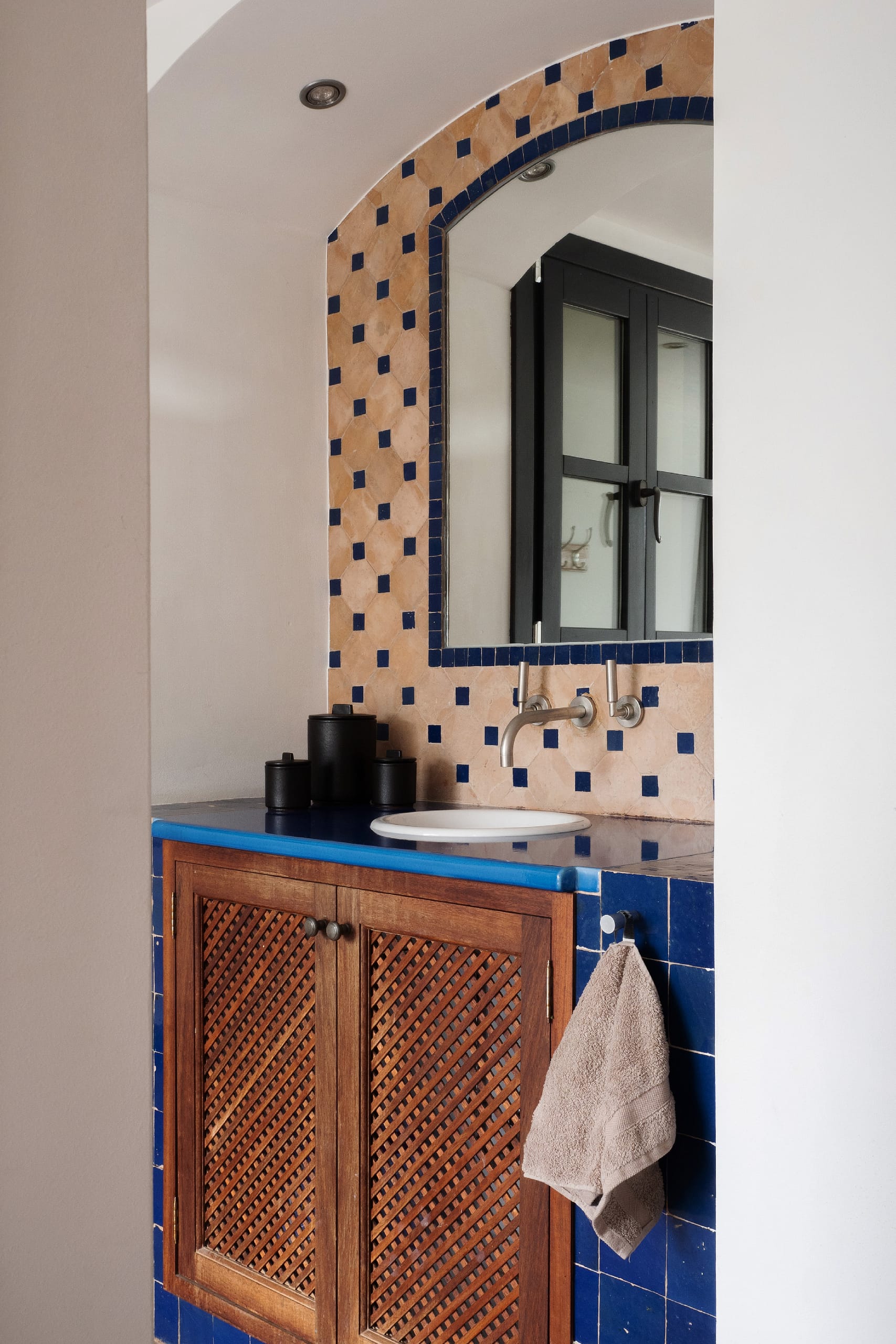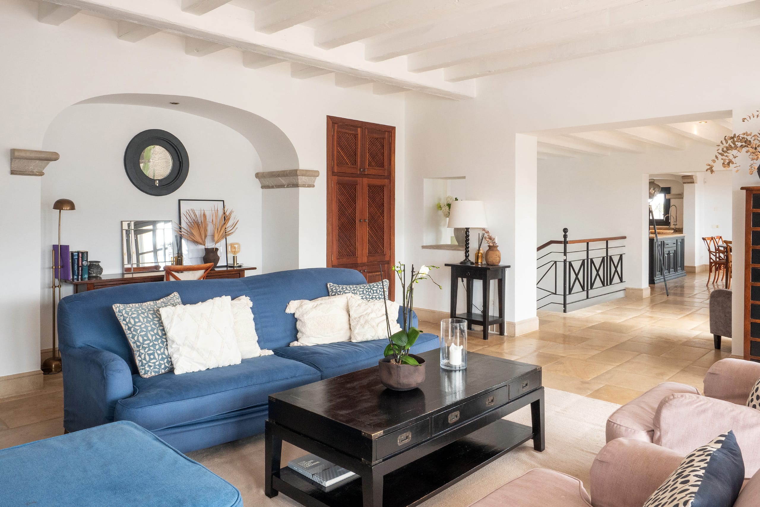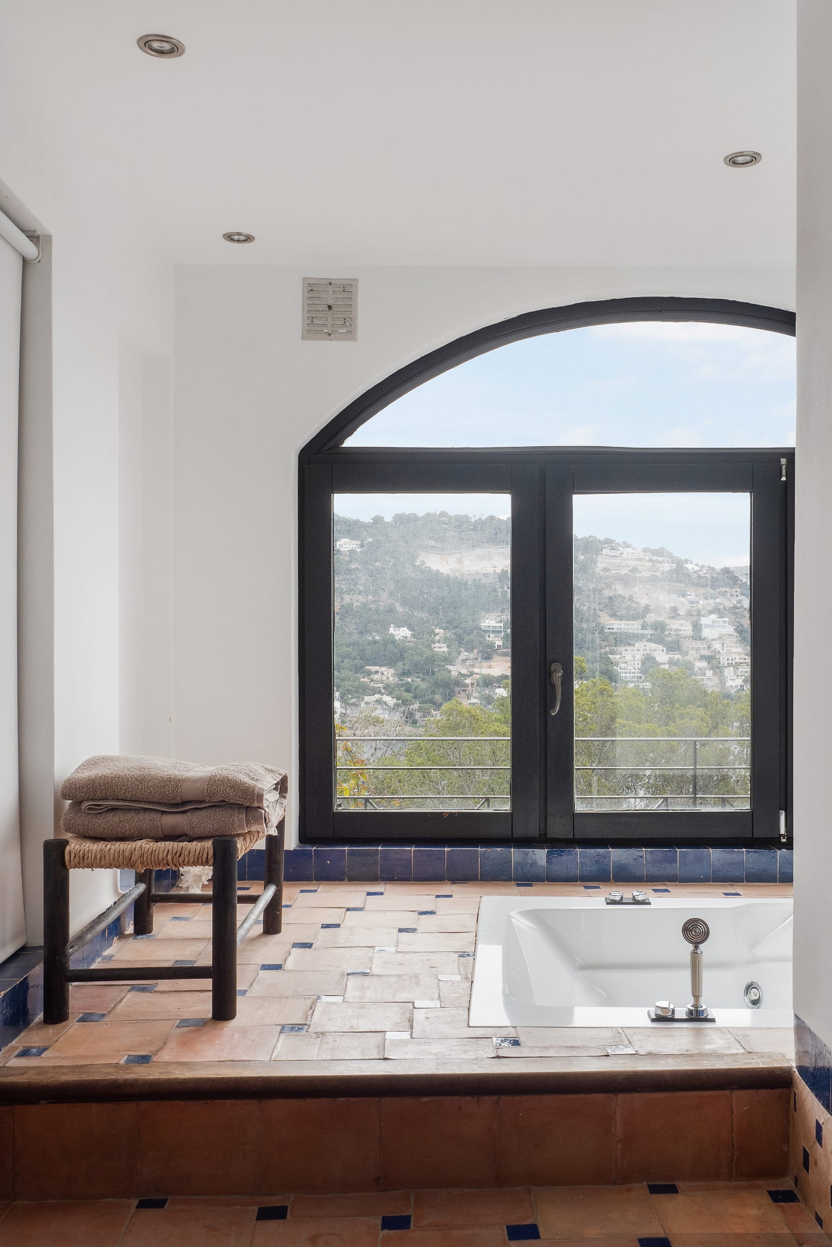 At the heart of the villa is a bespoke, fully fitted kitchen with direct access to the generous pool area. This inviting outdoor space is perfect for entertaining and relaxing alike, with multiple seating areas spread across the terraces, ideal for long lunches, sunset dinners, or quiet moments in the shade. The swimming pool is complemented by a jacuzzi, adding a touch of luxury to everyday life.