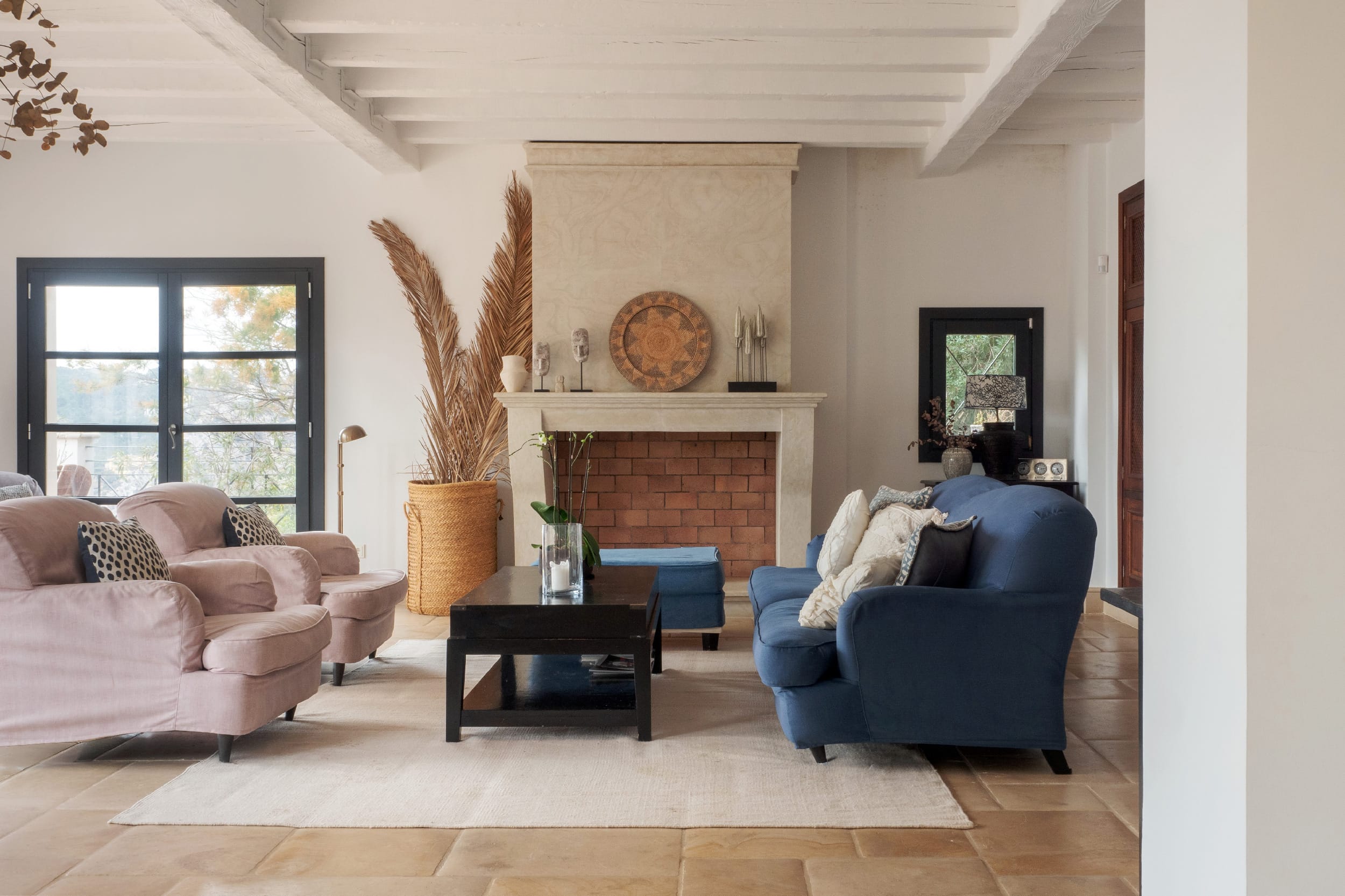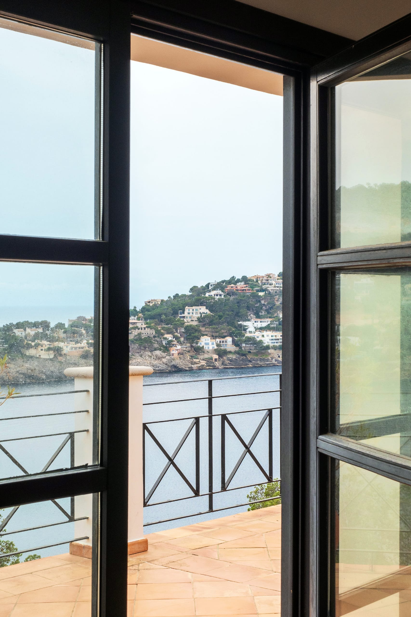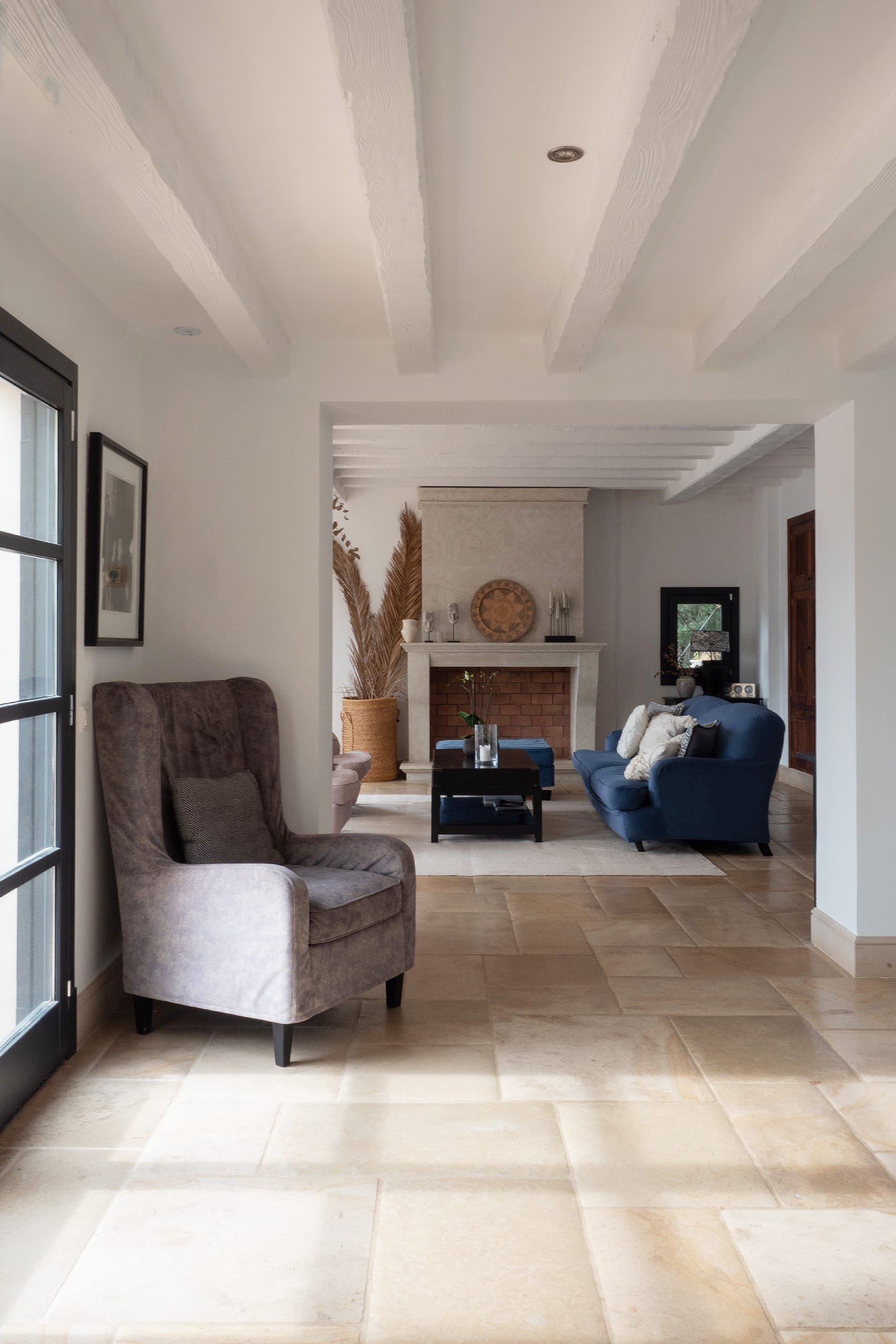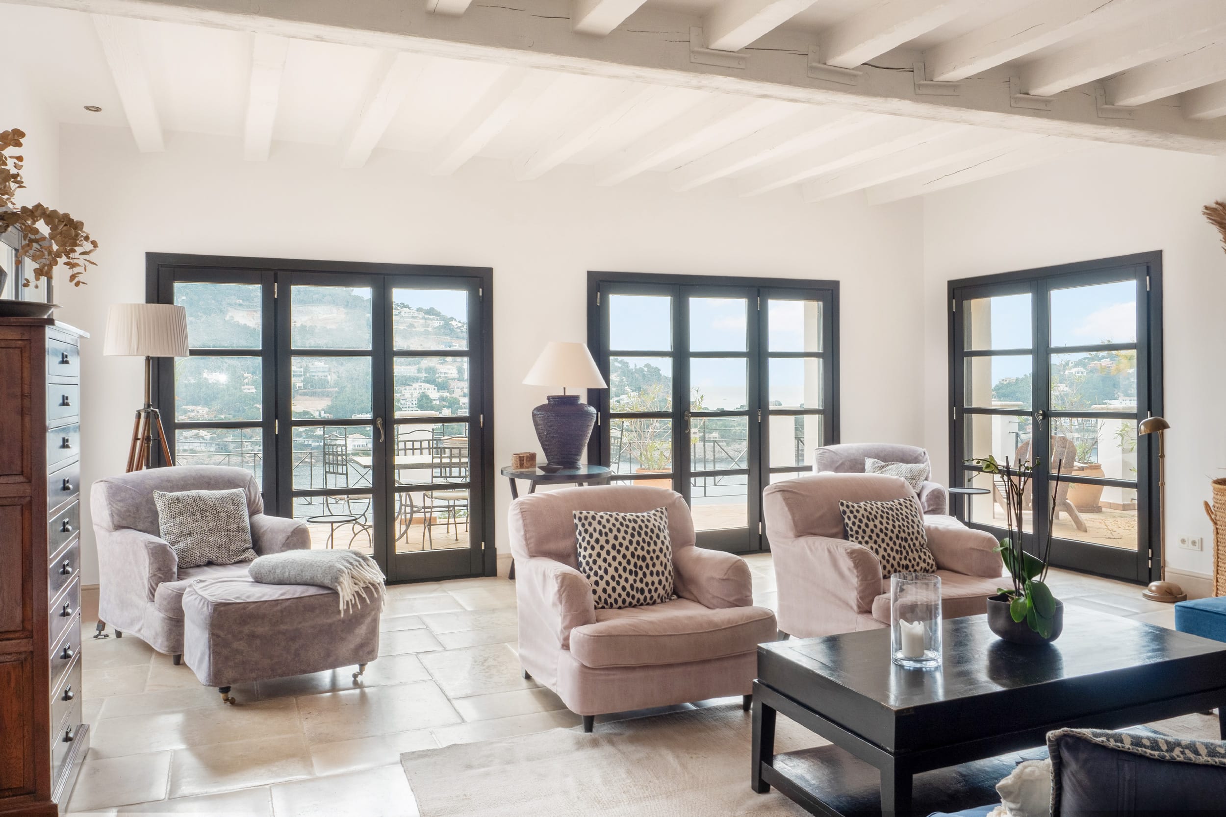 The bright and spacious living room features an open fireplace and charming, mullioned windows that frame stunning views of the sea, creating a warm and welcoming atmosphere throughout the year. From here, the villa flows effortlessly onto the terraces, enhancing the sense of space and light.