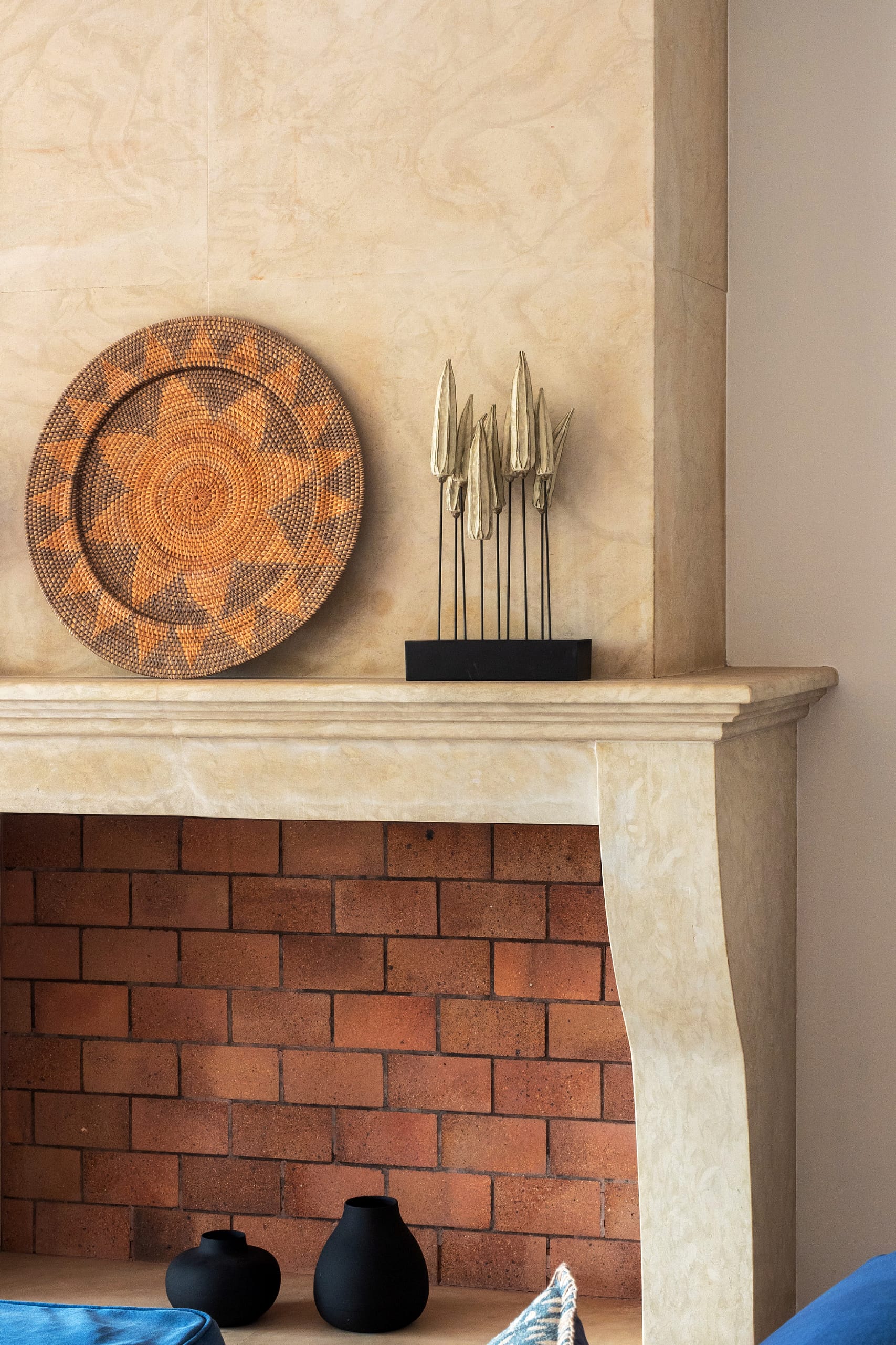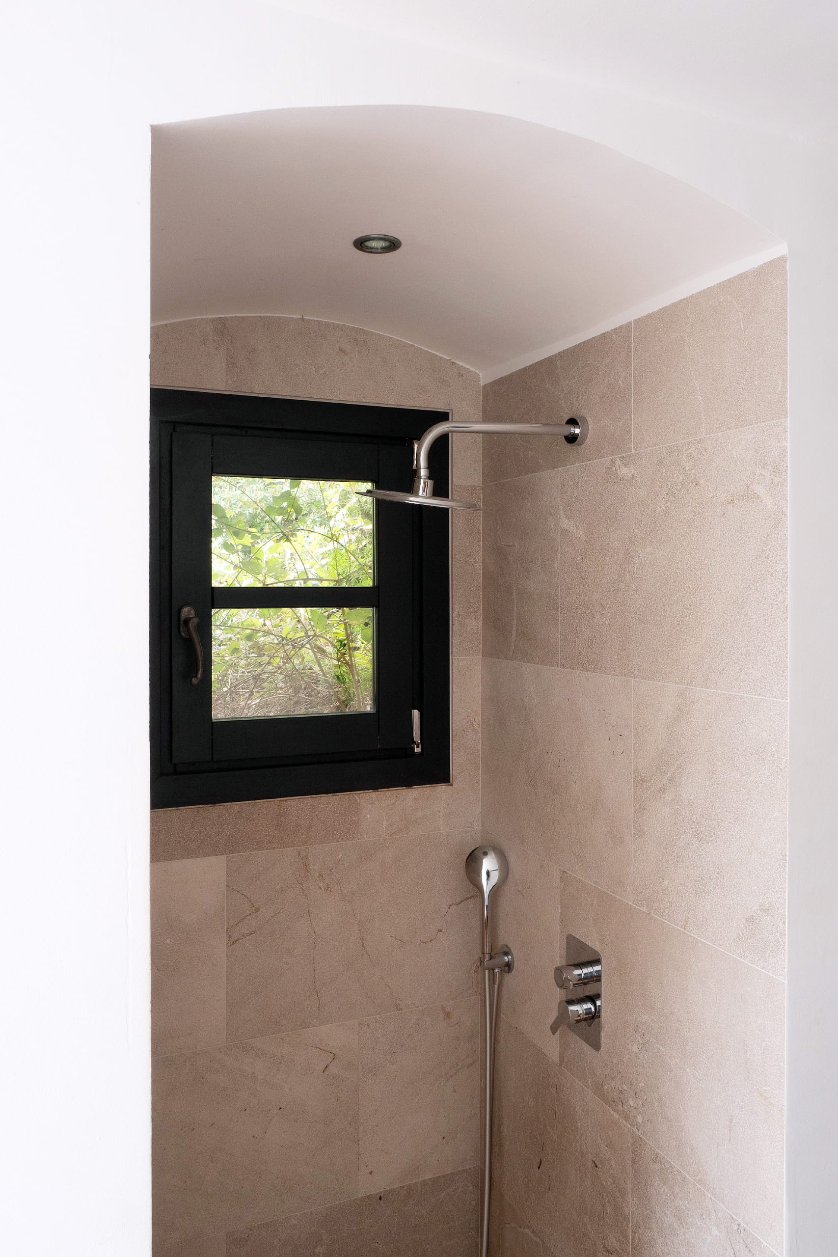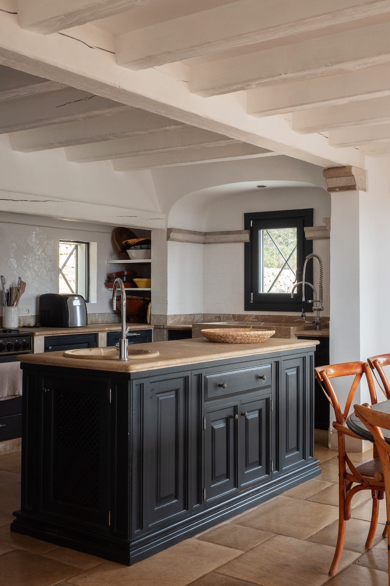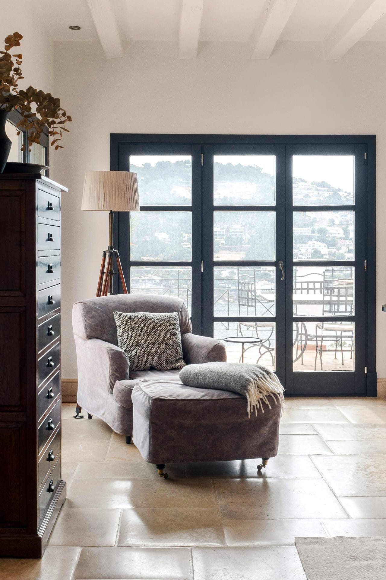 The bright and spacious living room features an open fireplace and charming, mullioned windows that frame stunning views of the sea, creating a warm and welcoming atmosphere throughout the year. From here, the villa flows effortlessly onto the terraces, enhancing the sense of space and light.